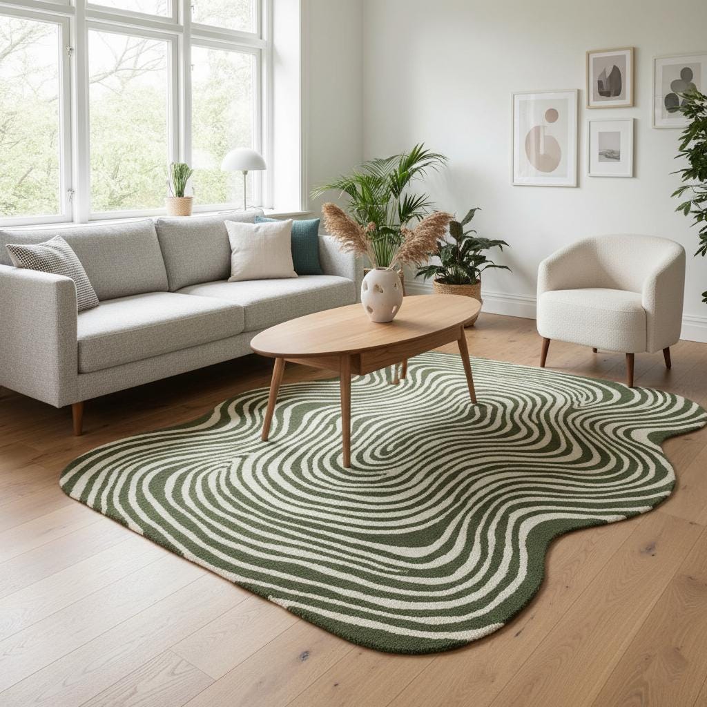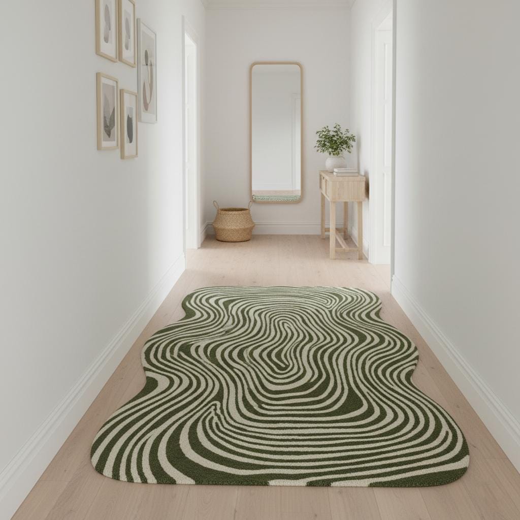 Modern Wavy Green Rug – Abstract Line Art Area Rug for Contemporary Homes