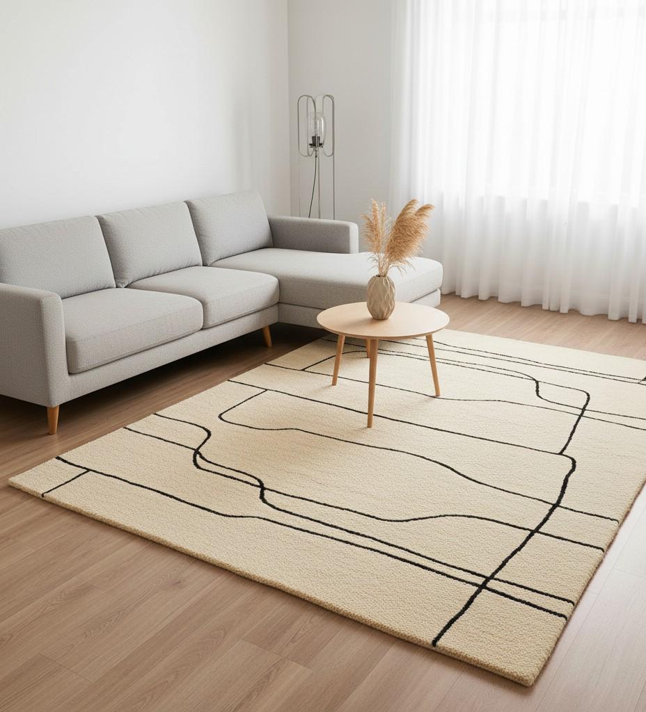 Handmade Wool Rug – Minimalist Black Line Art, Modern Beige Carpet