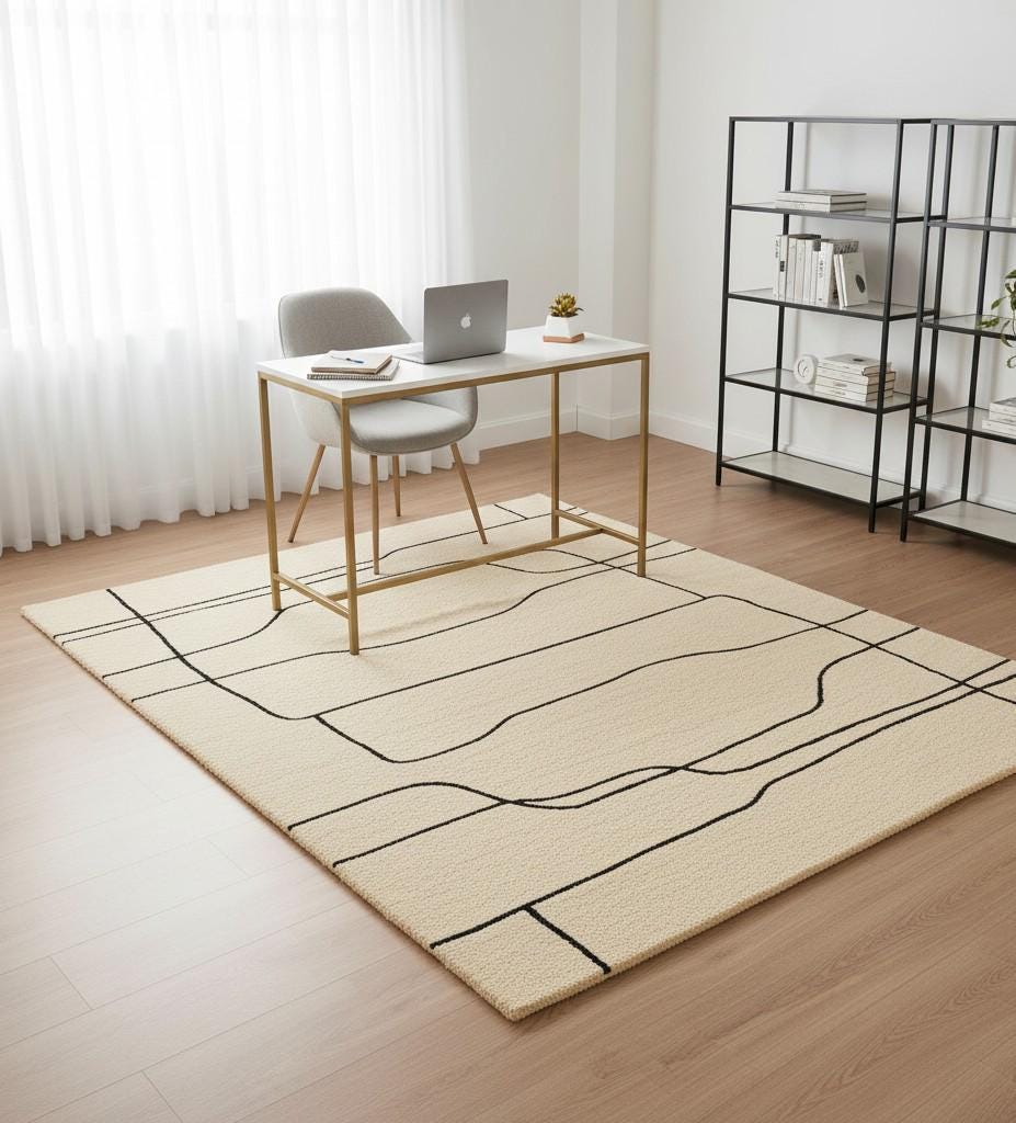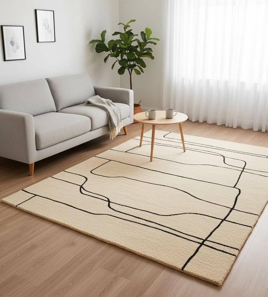Bring timeless elegance and artistic simplicity to your home with this luxury hand-tufted wool rug from Crafted Threads Rugs. Designed for those who appreciate modern minimalism and handcrafted quality, this rug combines warm beige tones with bold black line art — creating a balanced, statement piece for any room. ✨