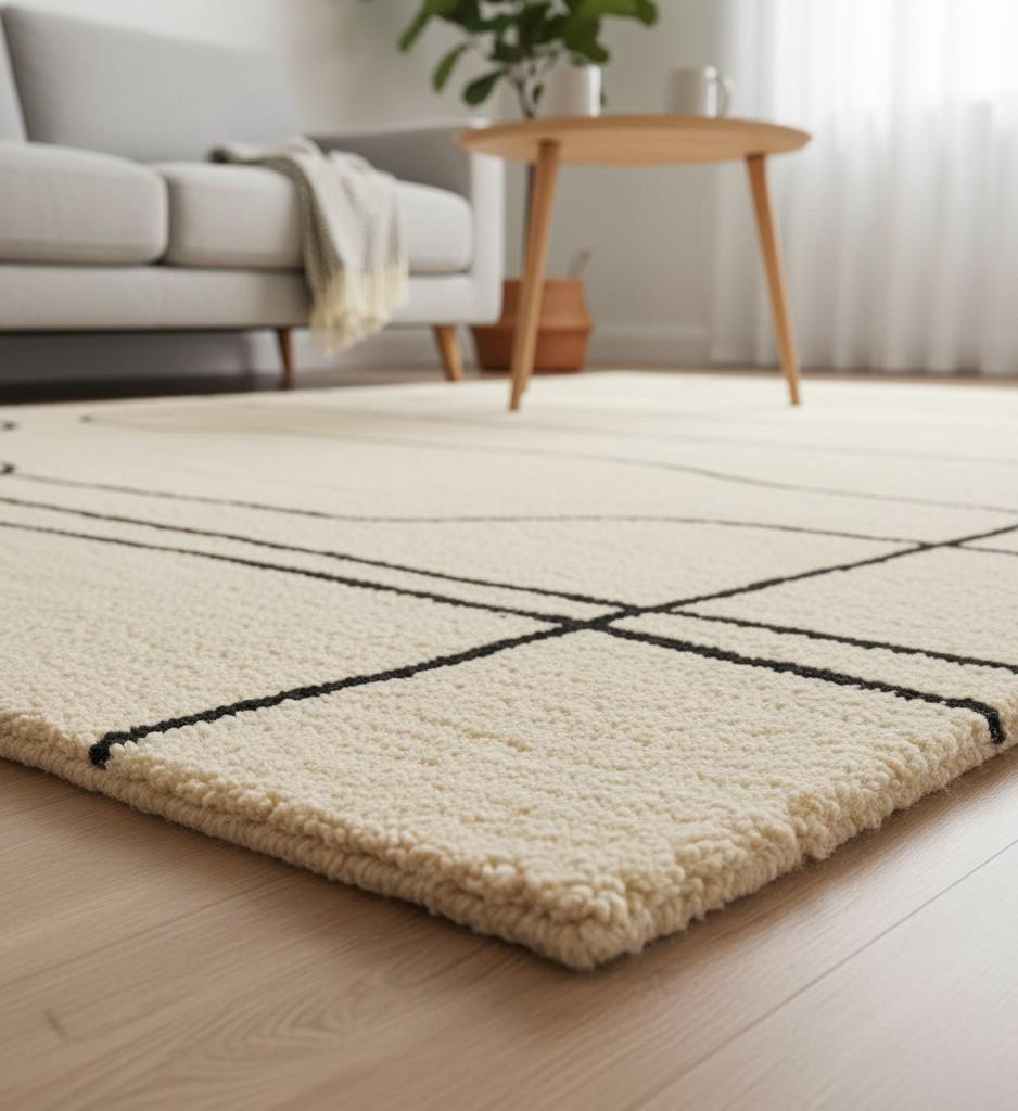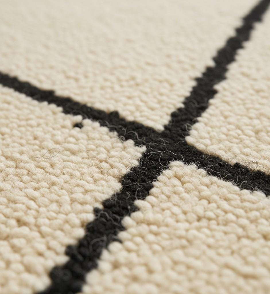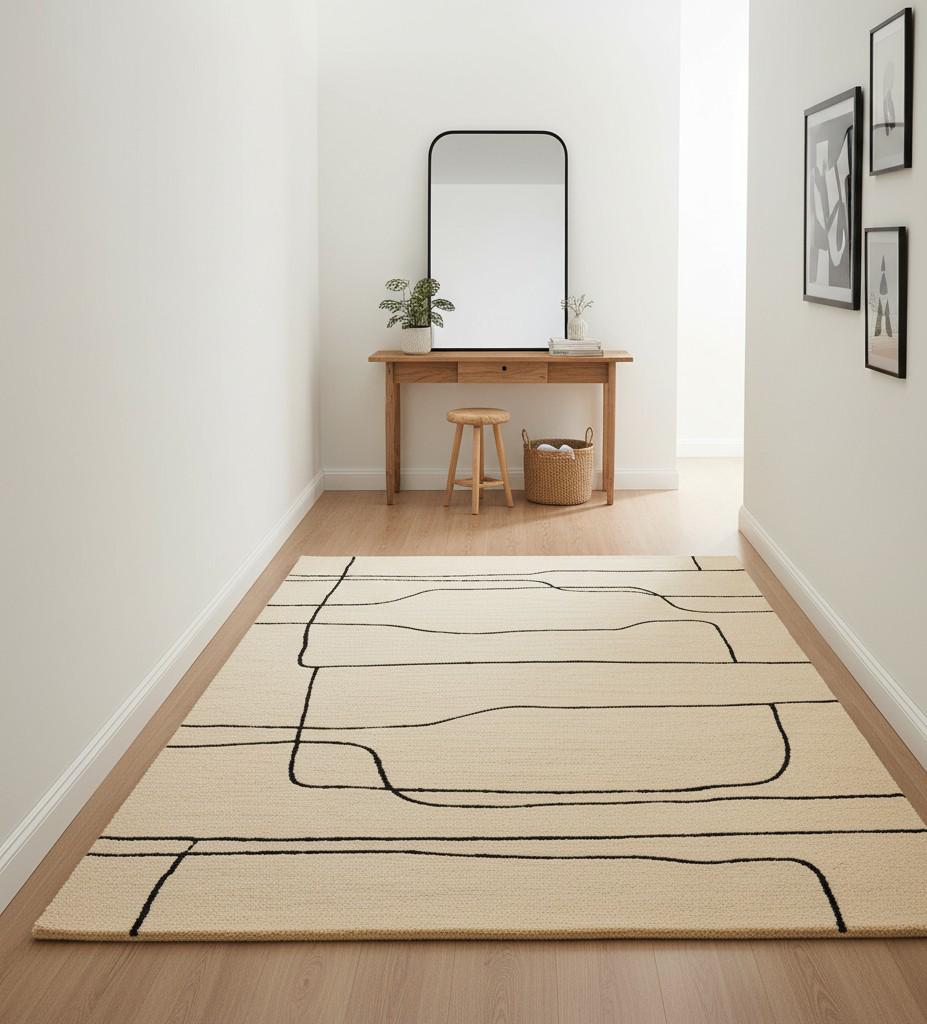🔑 Keywords: handmade wool rug, minimal abstract rug, modern area carpet, luxury floor decor, beige black rug
