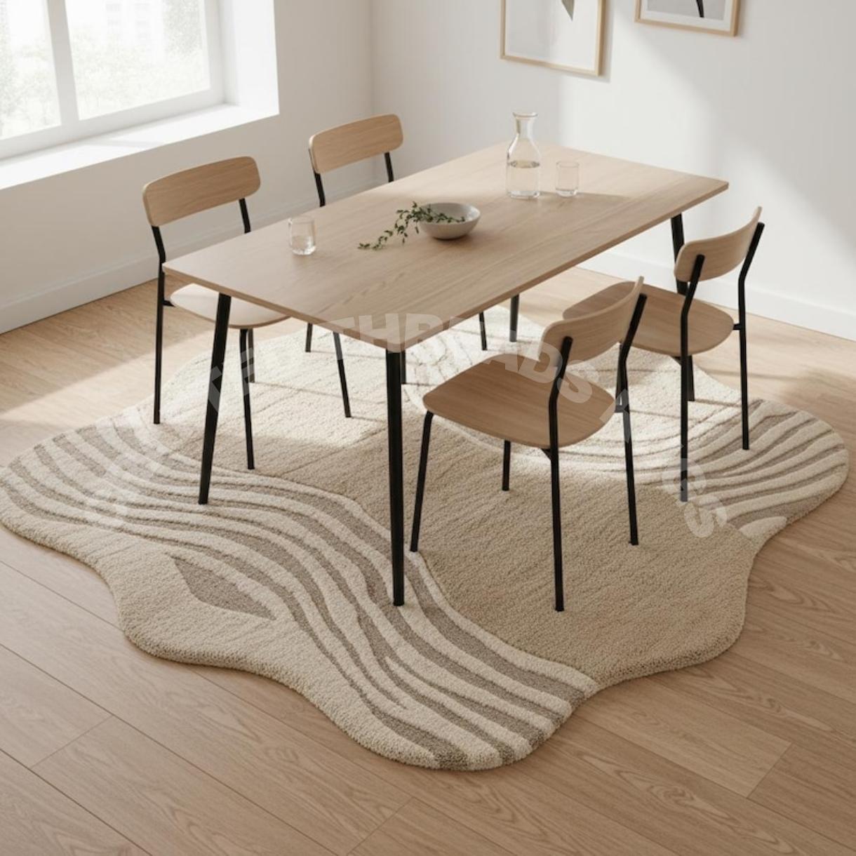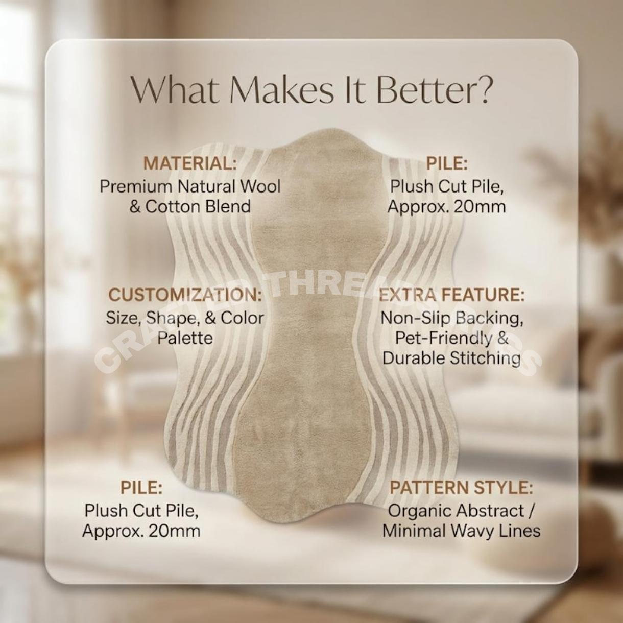 Handcrafted with premium-quality wool, this rug offers a plush feel underfoot while maintaining durability for everyday use. The scalloped organic silhouette and minimalist pattern make it a perfect statement piece for contemporary, Scandinavian, and luxury home décor styles.
