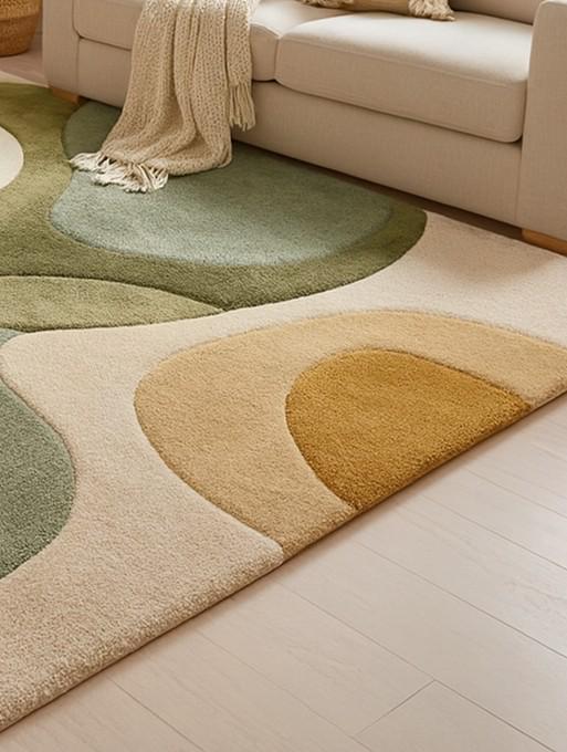 Abstract Green Beige Wool Rug, Modern Organic Shape Area Rug, Hand Tufted Luxury Carpet for Living Room Bedroom Home Decor
