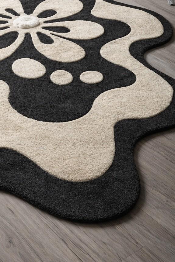 Elevate your space with this hand tufted abstract rug featuring an organic modern shape in timeless black and beige tones.