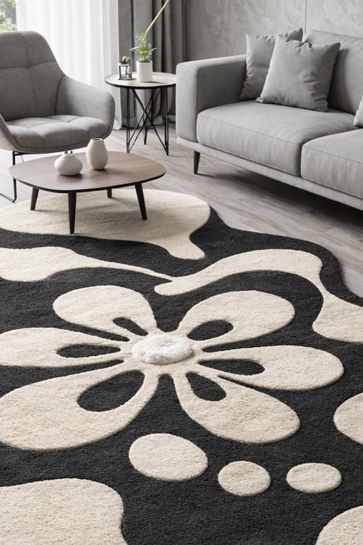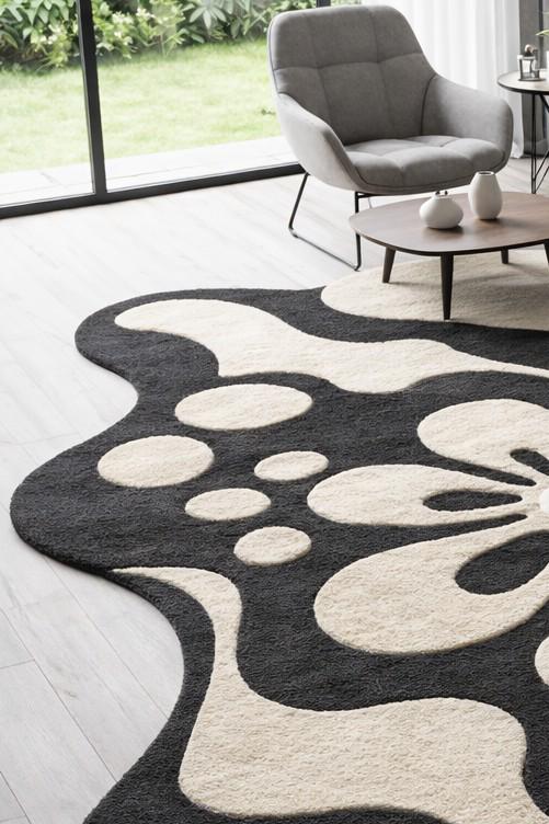 Hand Tufted Abstract Rug, Modern Black Beige Area Rug, Organic Shape Wool Carpet, Living Room Statement Rug, Custom Size