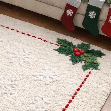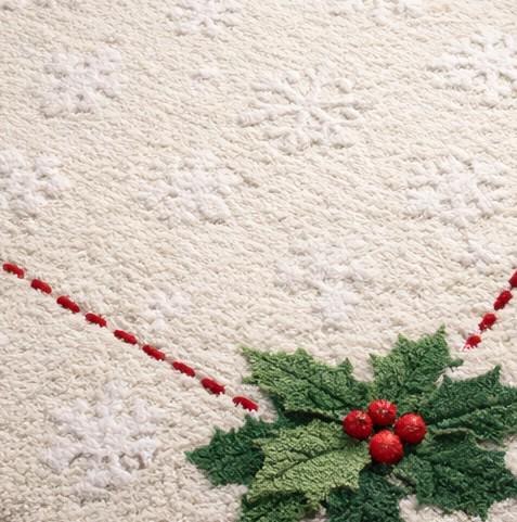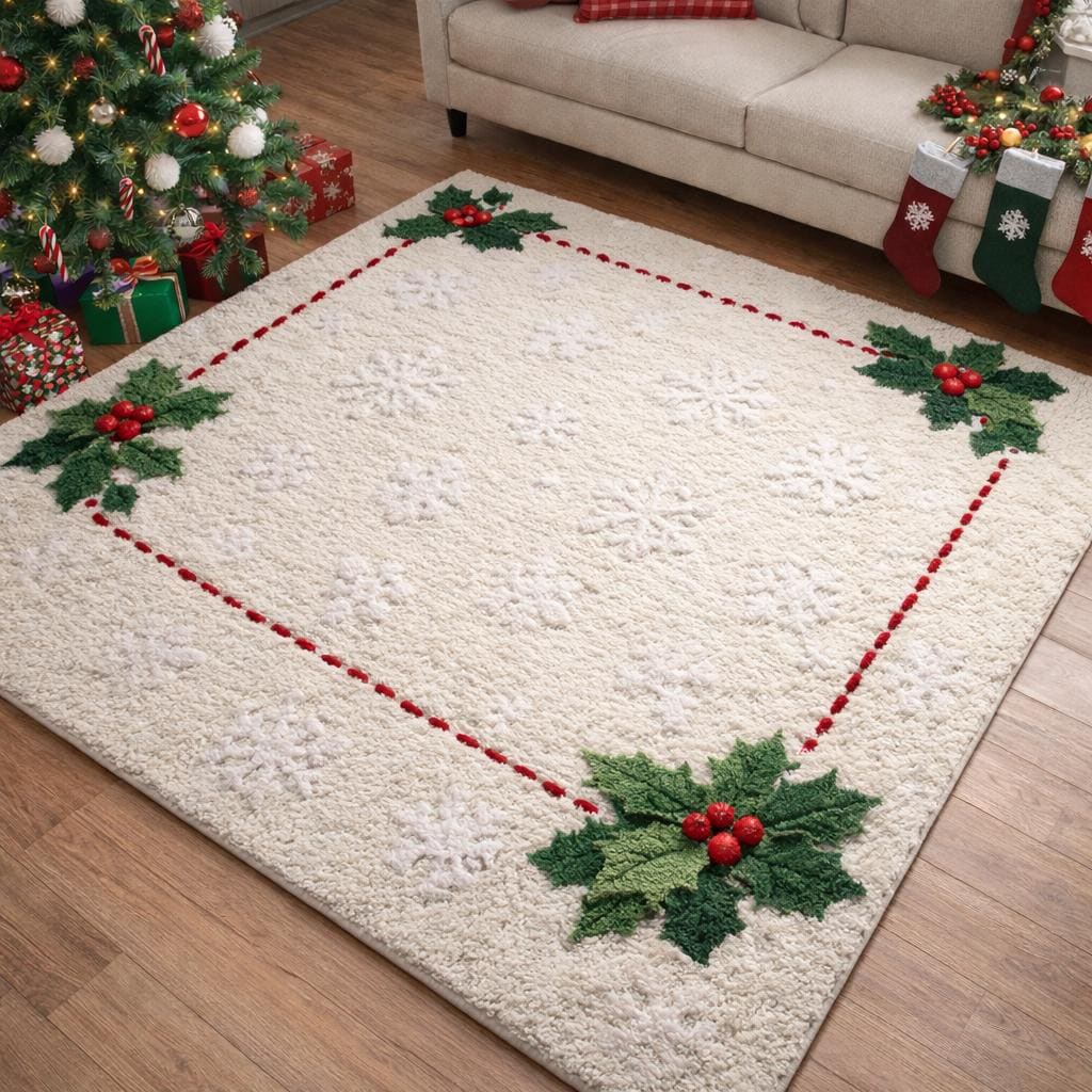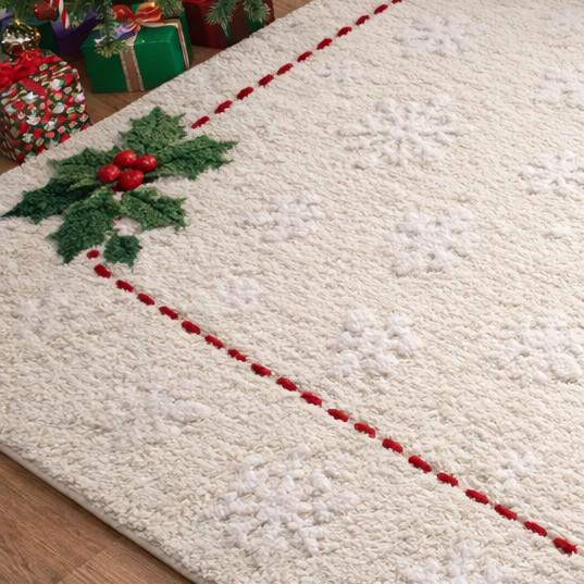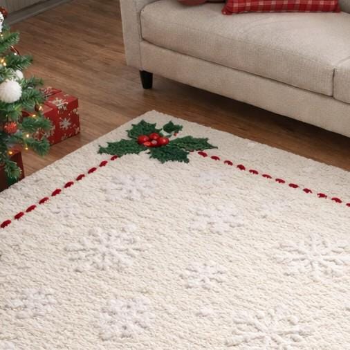 Create a warm and festive atmosphere with this hand tufted Christmas area rug featuring a soft white base and classic holly design.