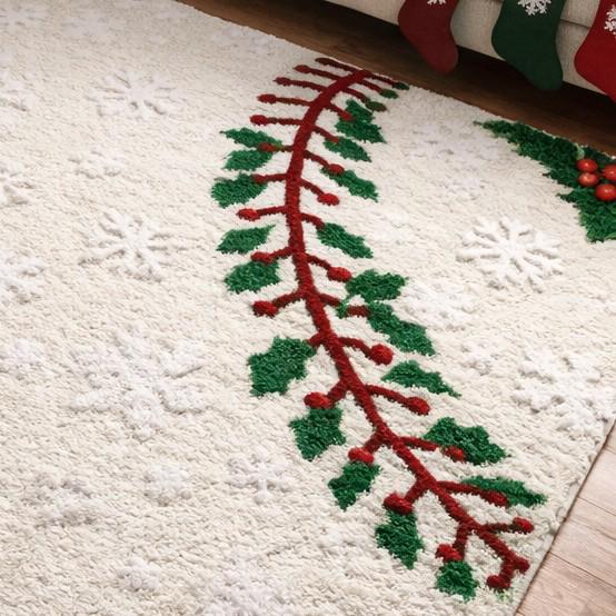 Add festive warmth to your home with this hand tufted Christmas area rug featuring a soft white base and elegant holly pattern.