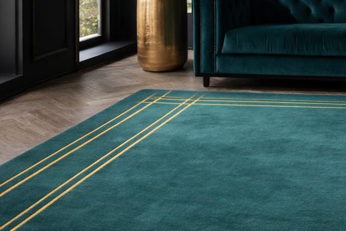 Elevate your interior with this hand tufted geometric area rug in rich teal green, accented with elegant gold line detailing.