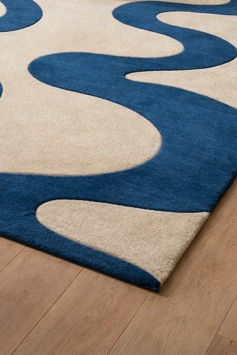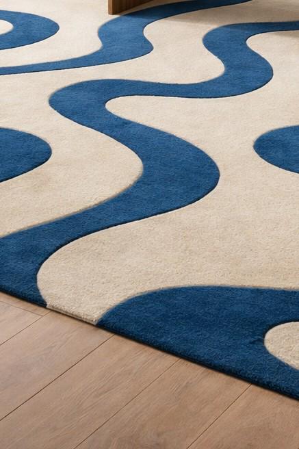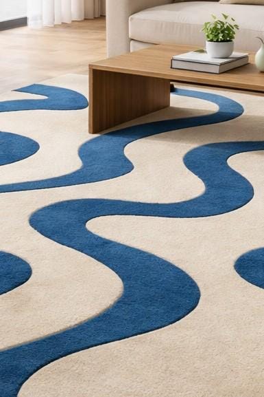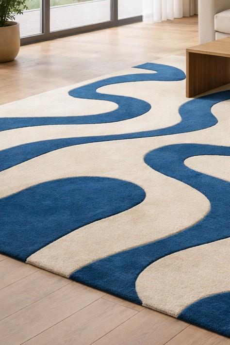 đHand Tufted Wool Rug, Modern Wavy Abstract Area Rug, Blue Beige Organic Shape Carpet, Luxury Living Room Rug, Custom Sizeđ