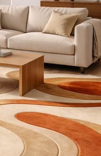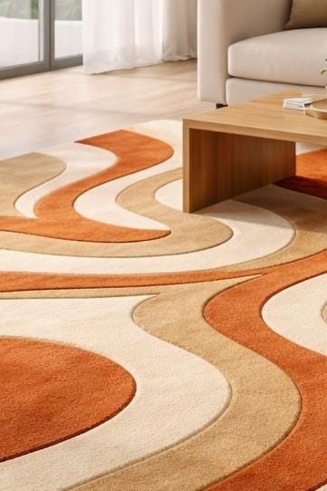 🌟"Hand-Tufted Modern Area Rug - Abstract Waves Design, Beige Orange Cream, Soft Wool Carpet for Living Room, Bedroom, Office"🌟