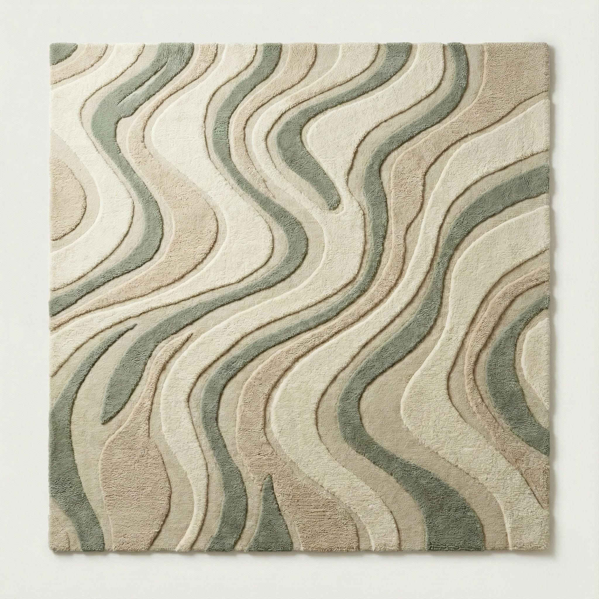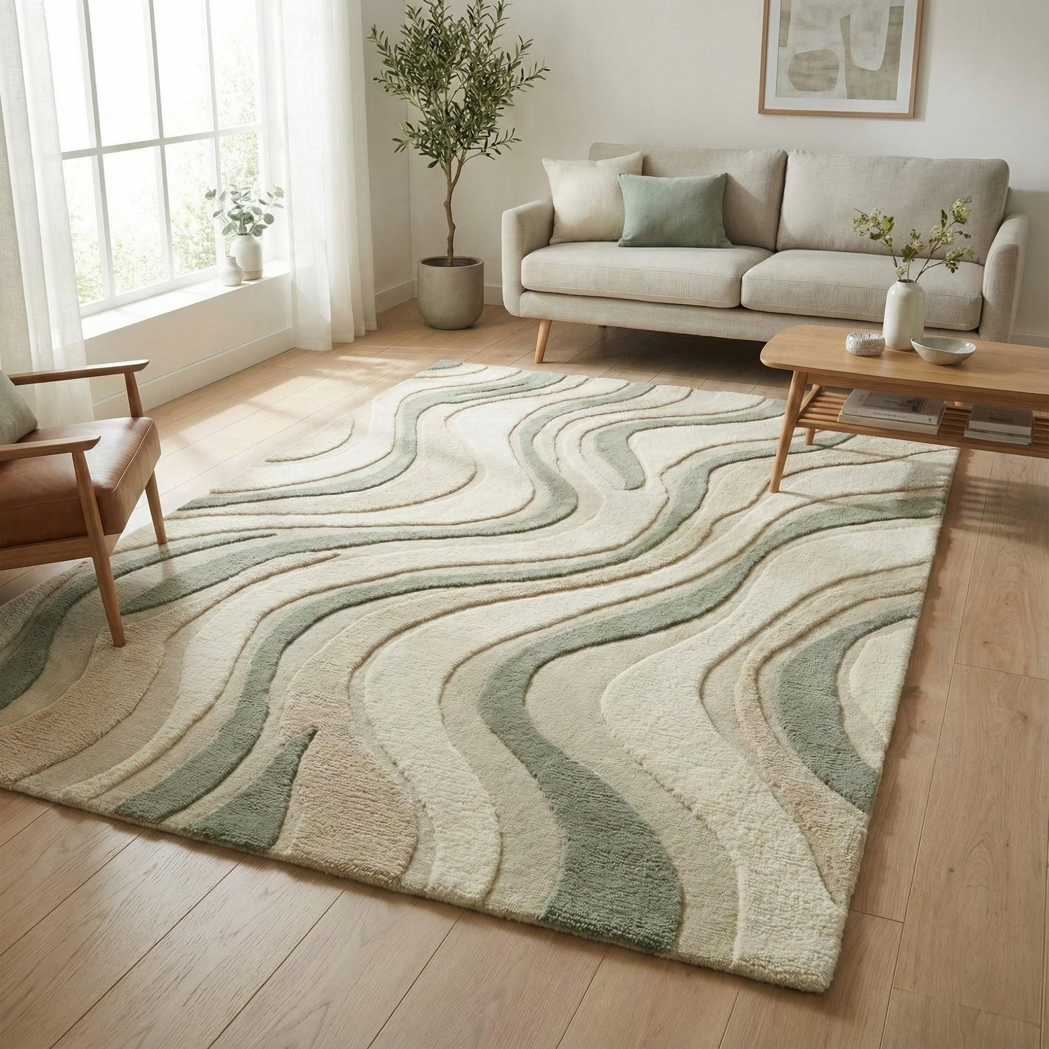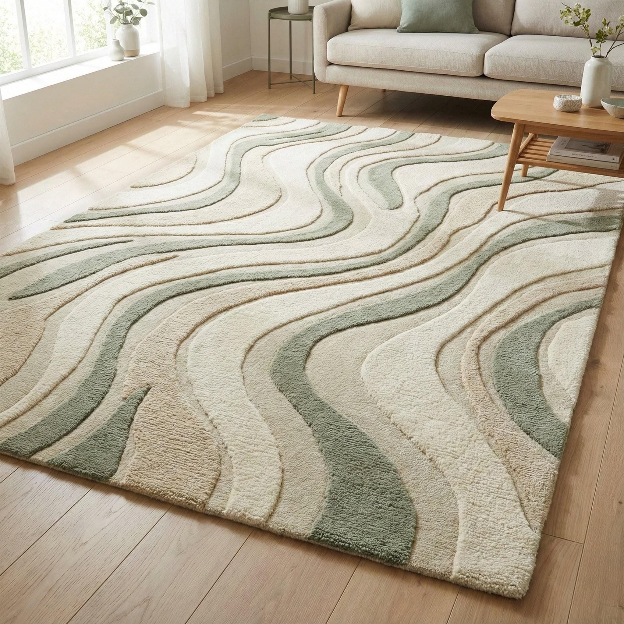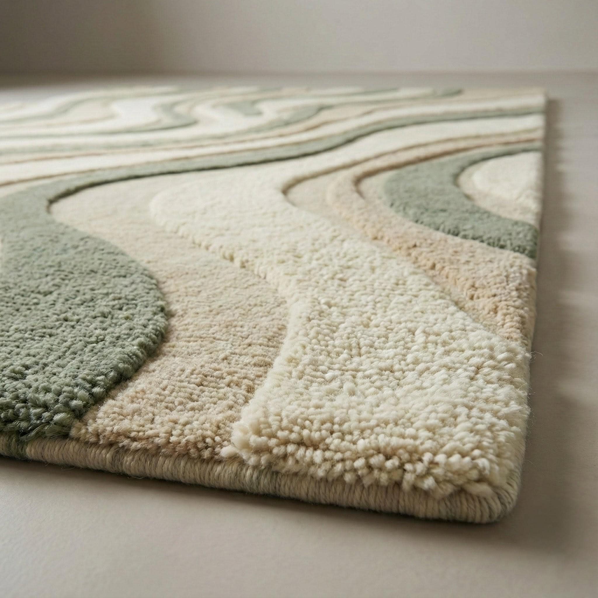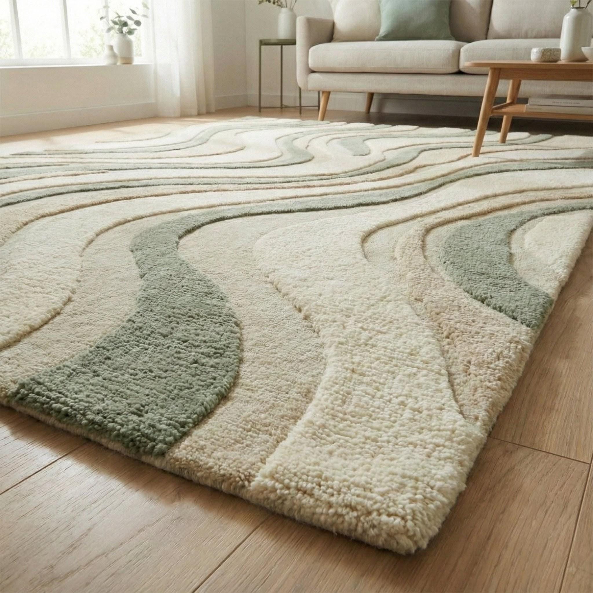 This hand-tufted organic wave wool rug is designed for modern interiors that value texture, calm colors, and premium craftsmanship. Featuring flowing sculpted wave lines in sage green and cream, this rug adds depth and softness without overpowering the space.