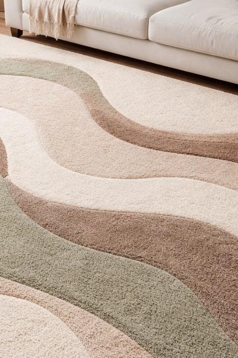 This hand tufted wool rug features a soft abstract wave design in soothing neutral tones of beige, sand, taupe, and subtle sage.