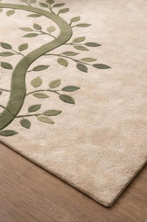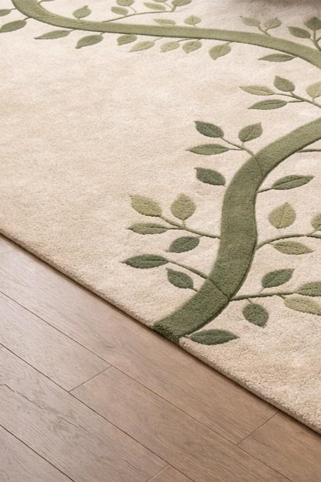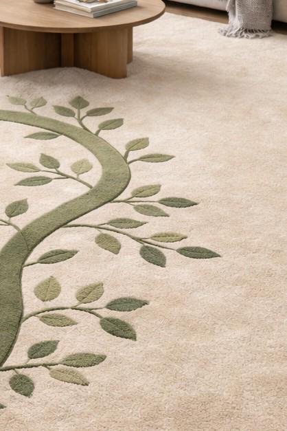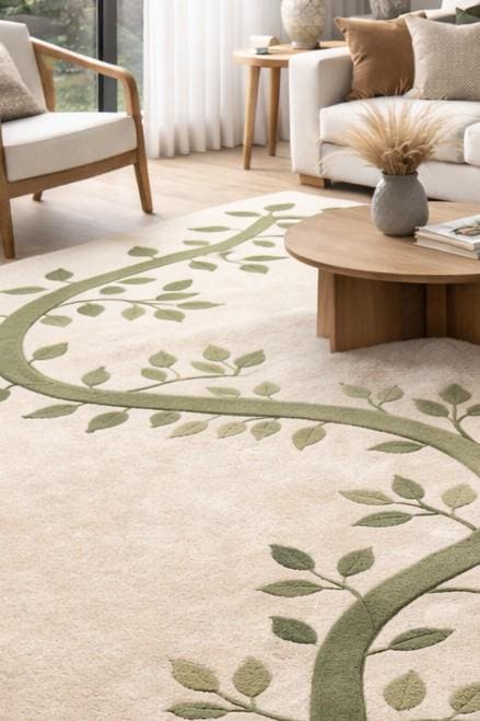 This nature-inspired area rug features a soft beige base with green vine and leaf detailing, handcrafted from premium wool for a plush, luxurious feel underfoot.