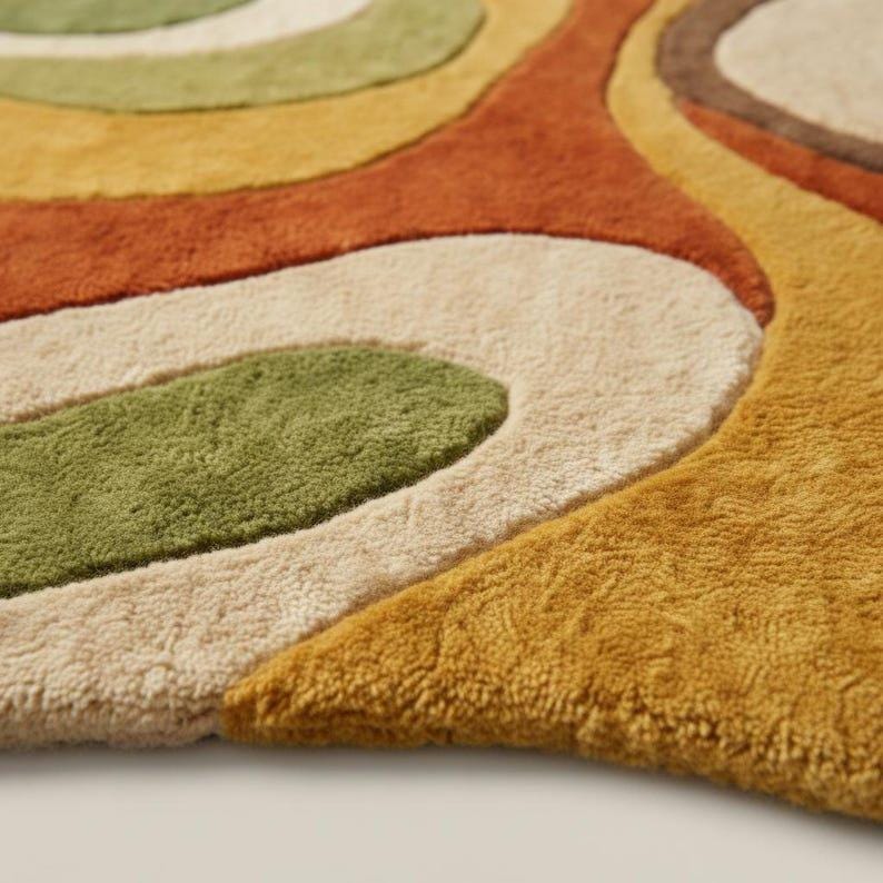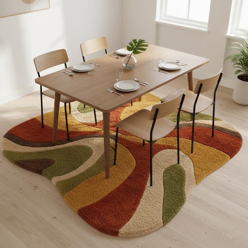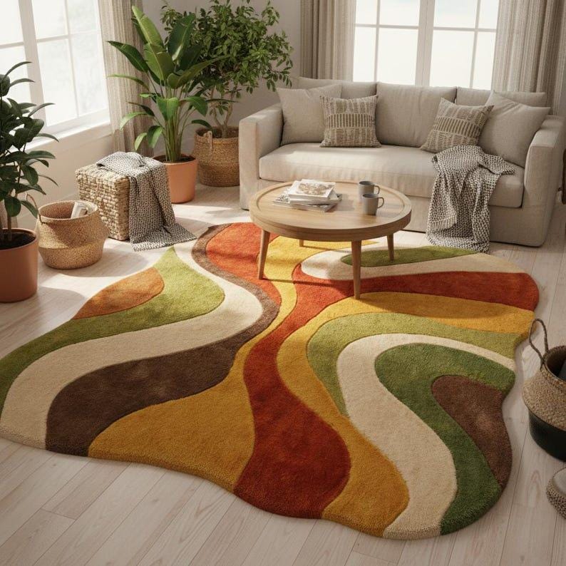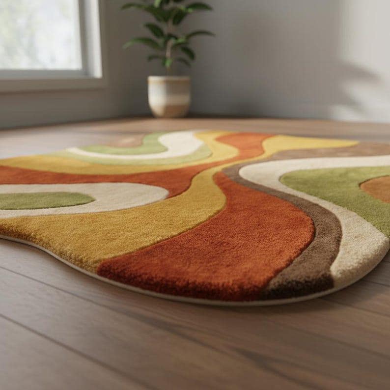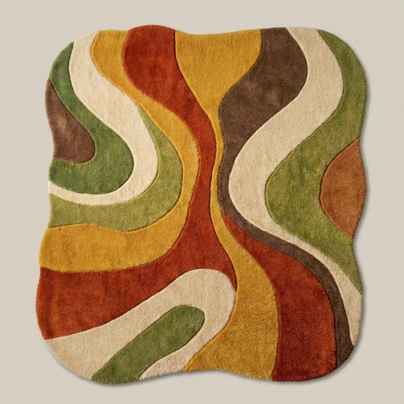 This hand-tufted abstract rug features a unique organic wavy shape with warm earthy colors like rust, mustard, olive green, beige, and brown.