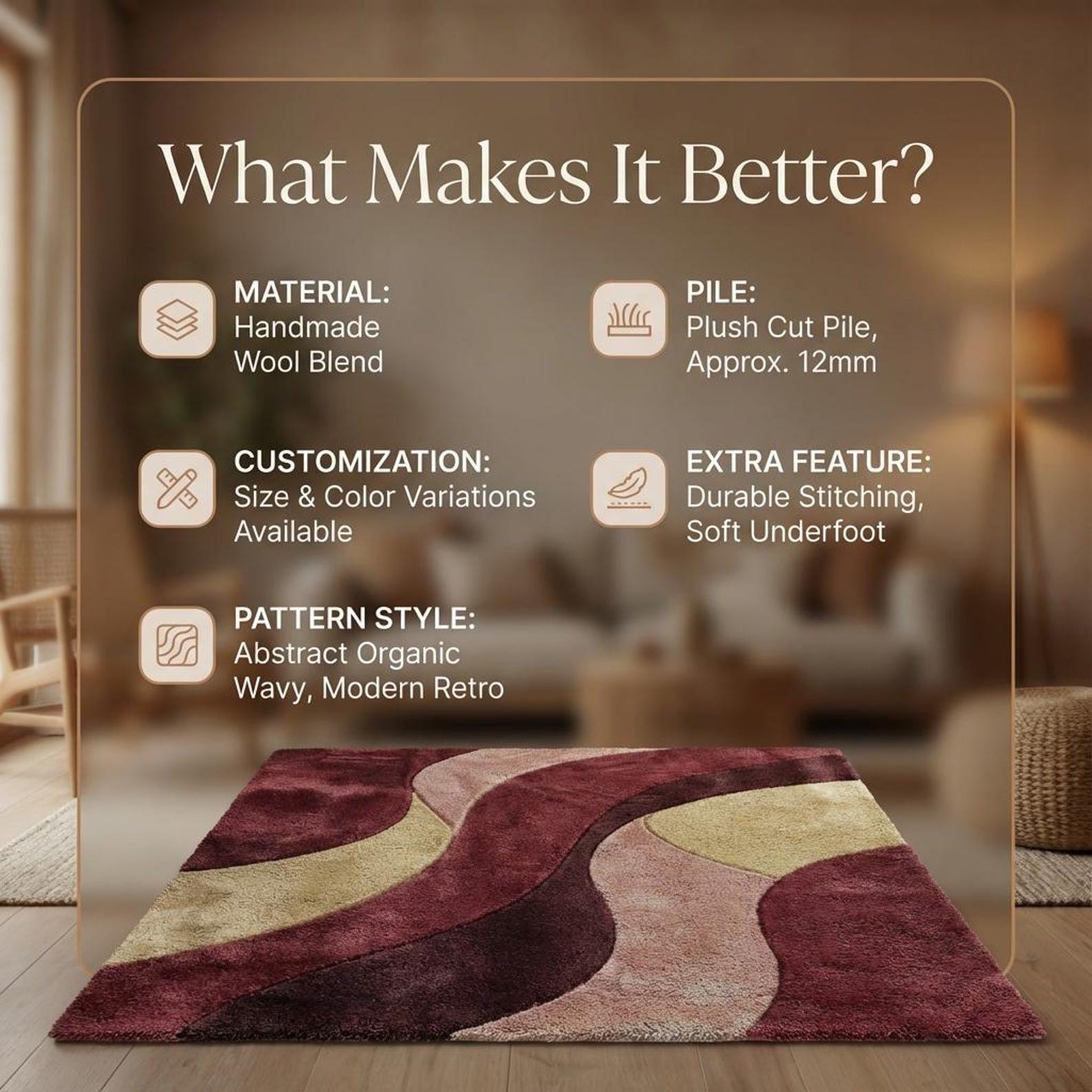 Rich burgundy, blush pink, soft beige, and yellow tones flow in organic curves, giving a modern retro vibe that looks stunning in living rooms, bedrooms, dining areas, or cozy corners.