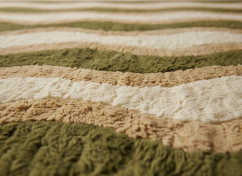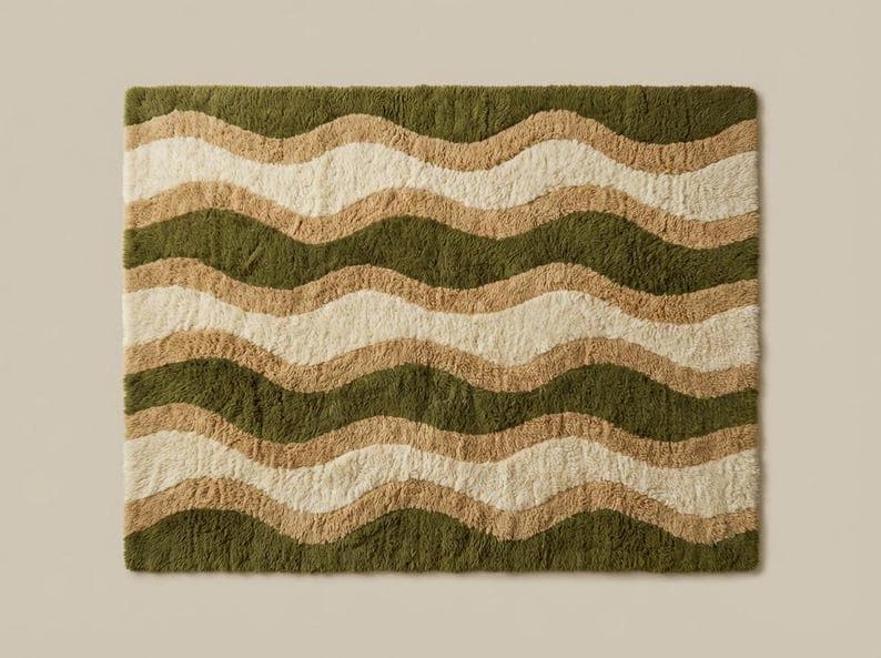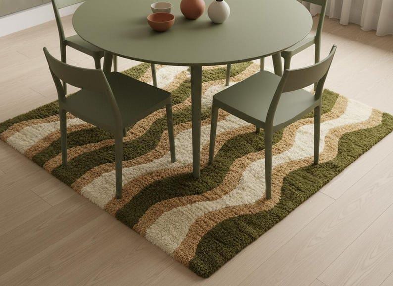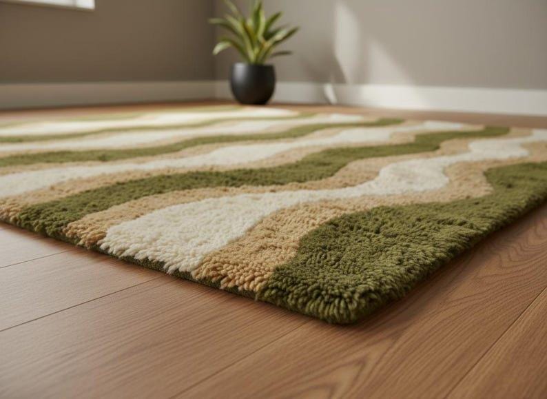 🌟Green Wavy Wool Rug, Handmade Tufted Area Rug, Olive Beige Cream Abstract Rug, Modern Organic Wave Carpet, Custom Size Rug🌟