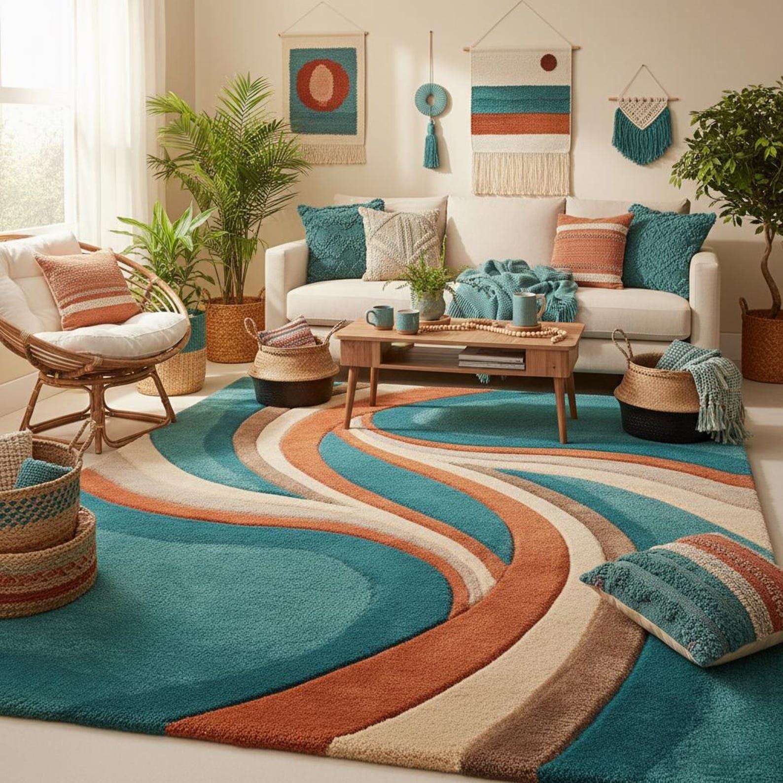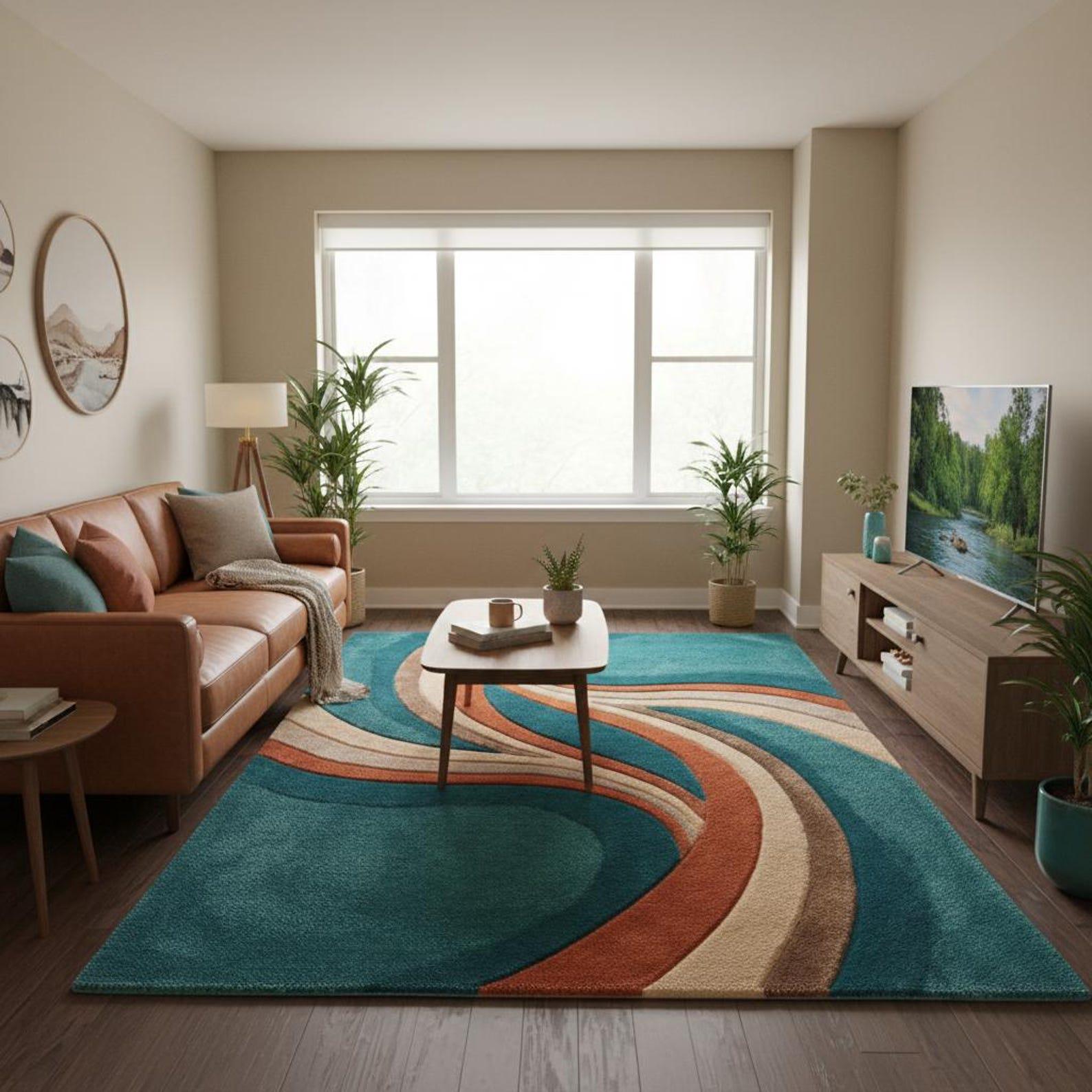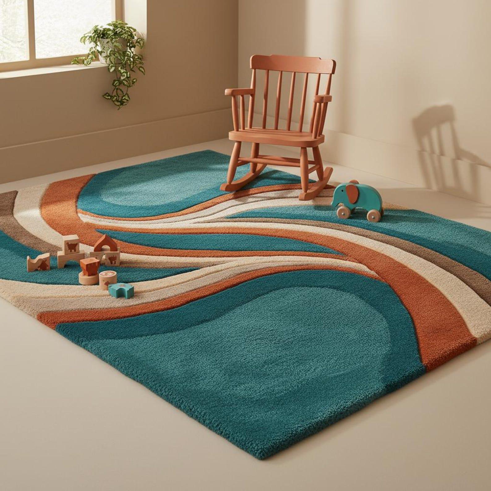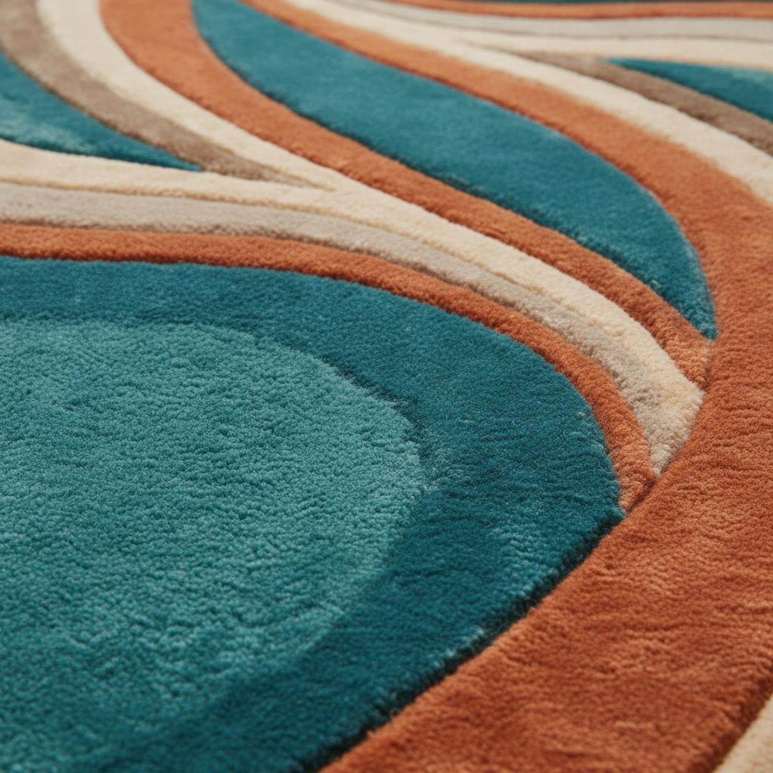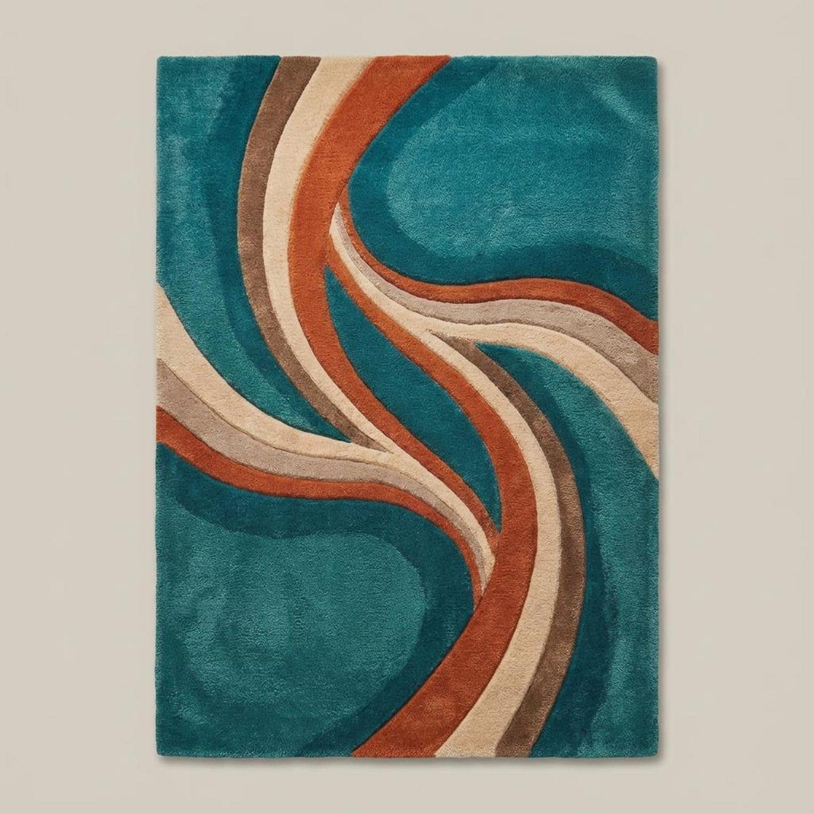 Premium hand tufted wool rug with a flowing abstract wave design in teal, rust, and beige tones.