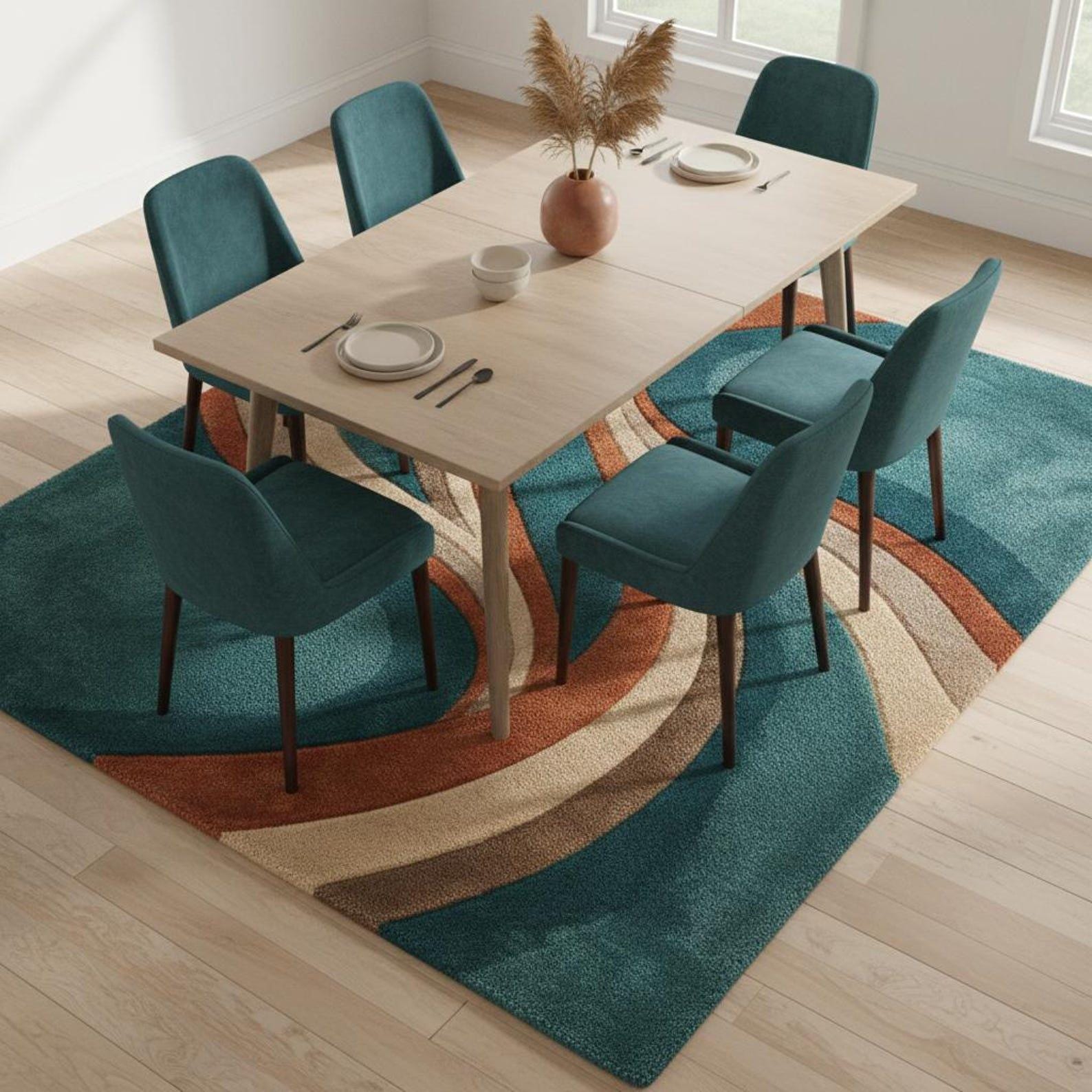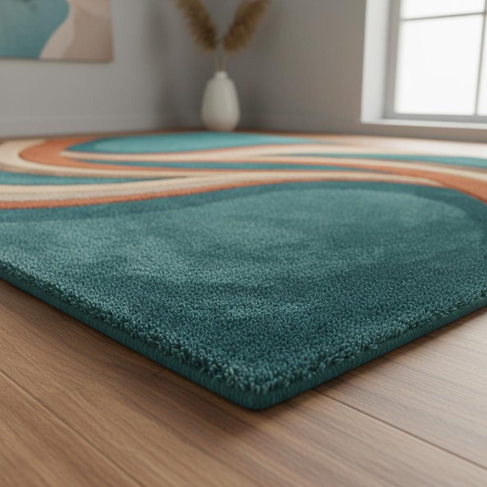 🌟Hand Tufted Wool Abstract Wave Rug, Modern Teal Area Rug for Living Room, Retro Curved Design Carpet, Custom Size Rug🌟