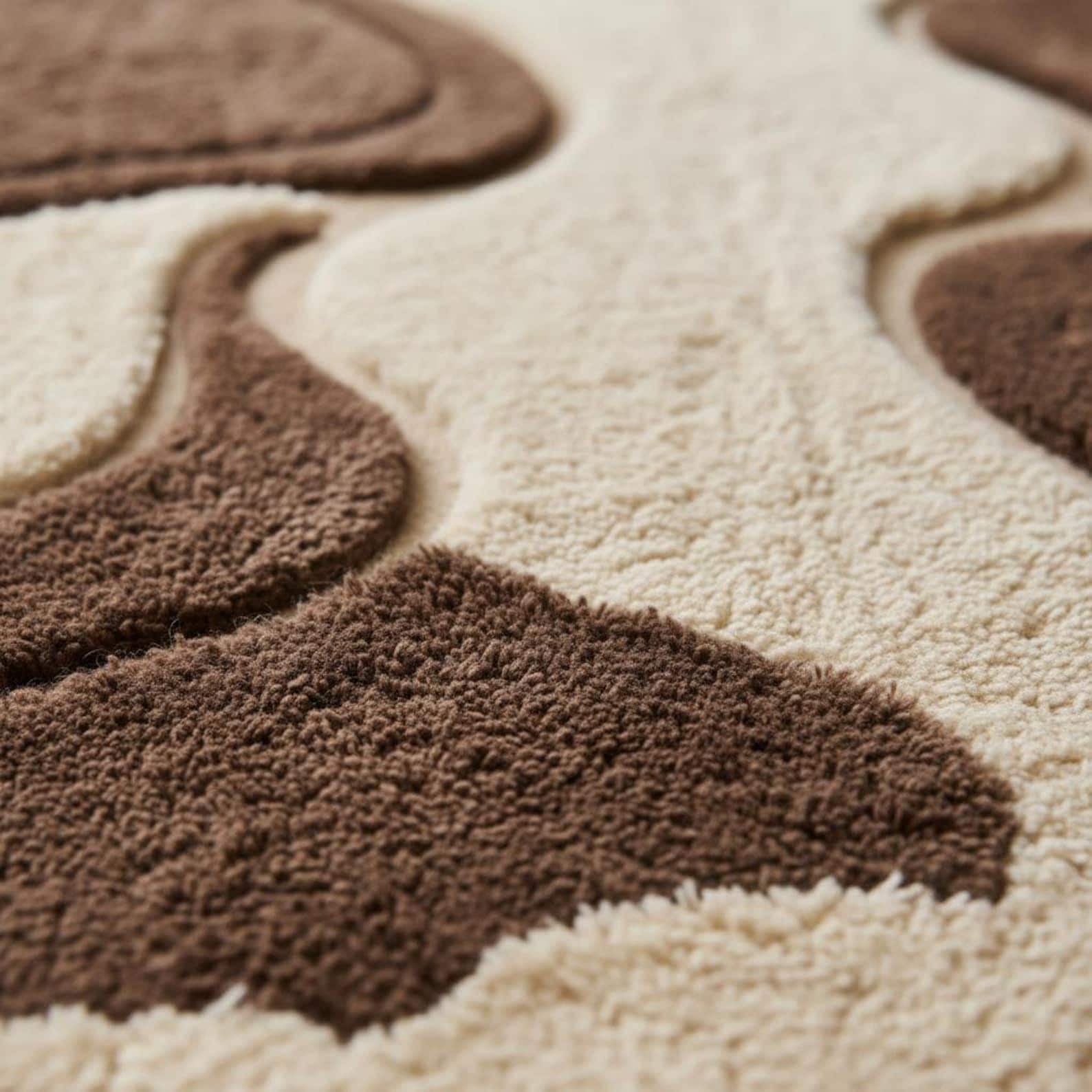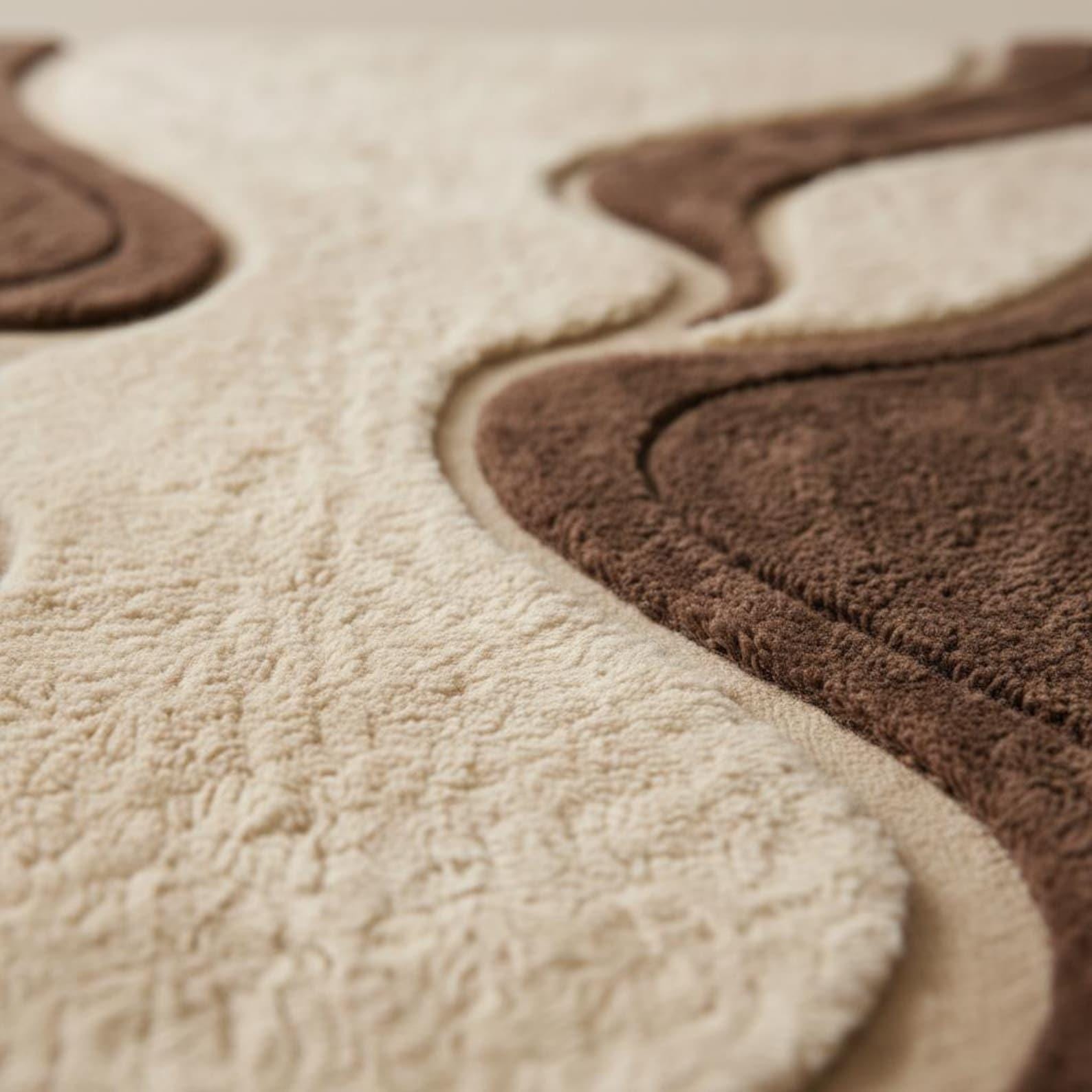 Premium hand tufted wool rug featuring an organic abstract wave design in warm brown and beige tones.