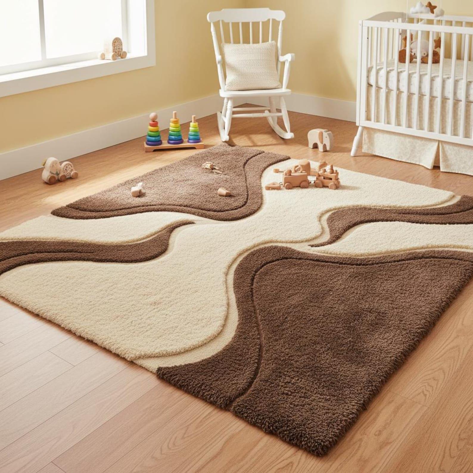 🌟Hand Tufted Wool Abstract Wave Rug, Modern Brown Beige Area Rug for Living Room, Organic Curved Design Carpet, Custom Size Rug🌟