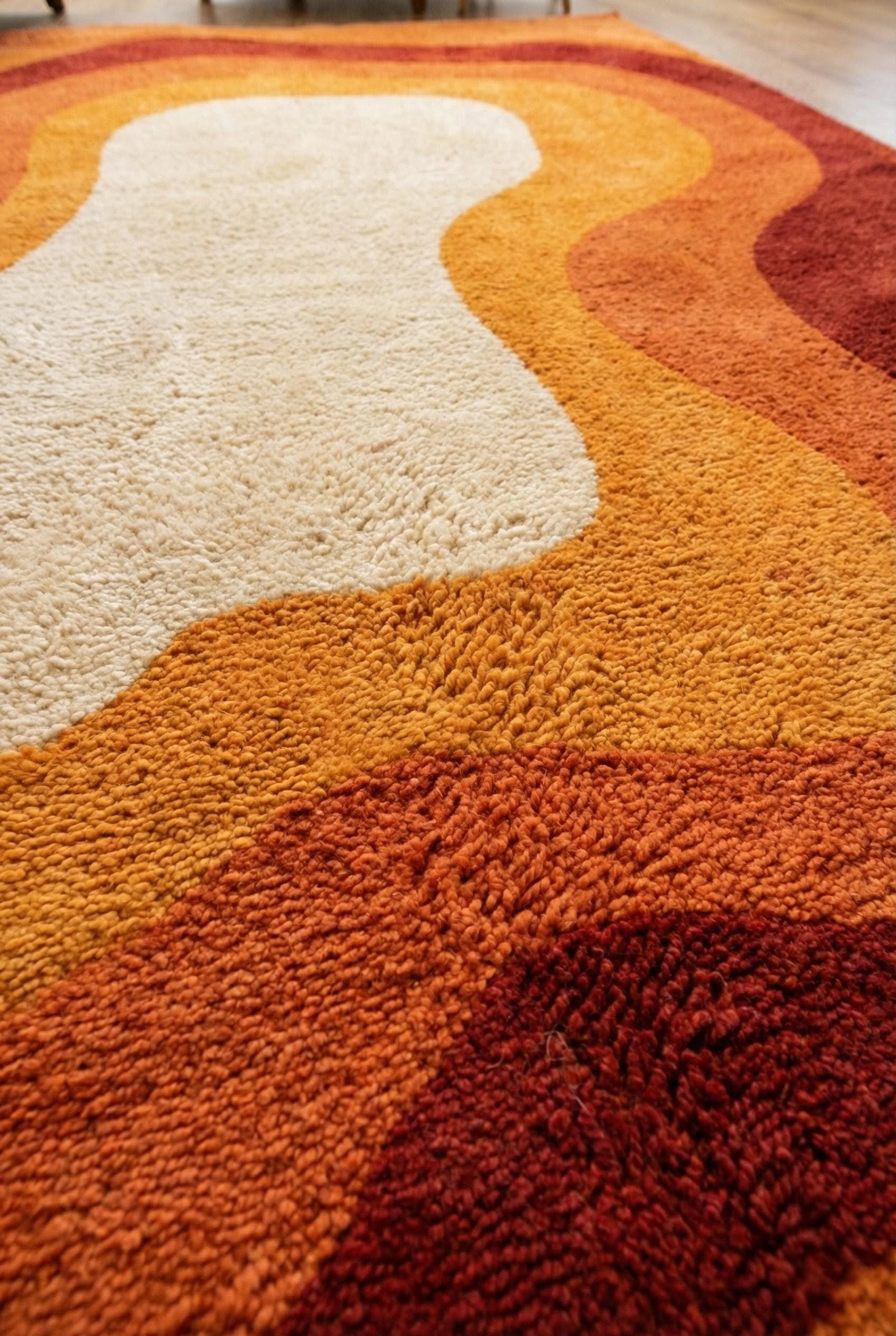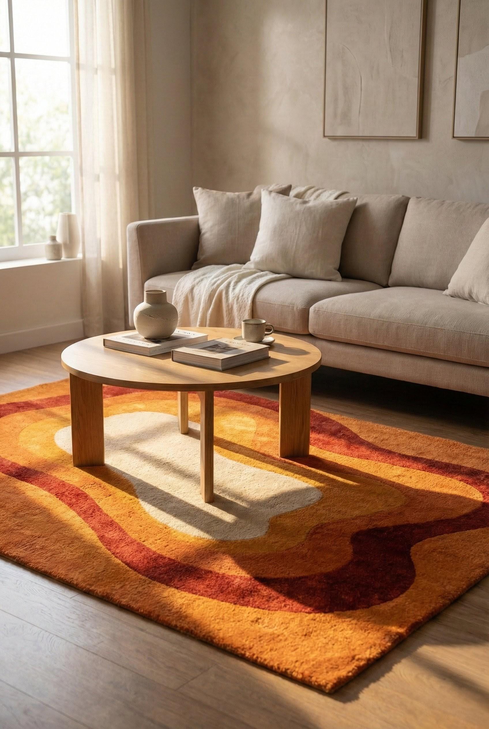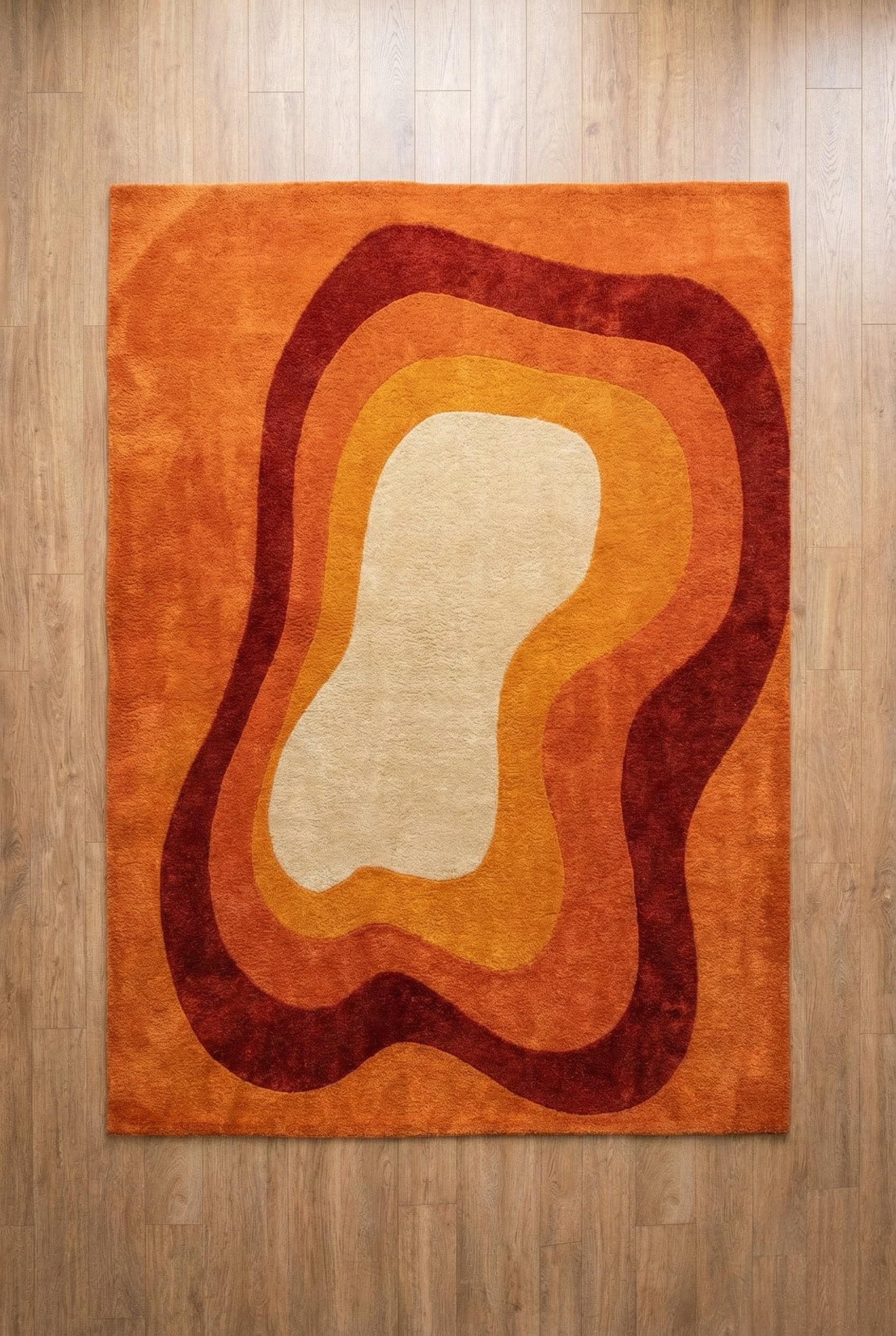 This rug is inspired by mid-century modern art and organic architecture, where form flows freely and color tells a story. The layered, wavy contours echo retro 1970s interiors while remaining timeless and modern. Warm terracotta, rust, amber, and soft ivory melt into one another, creating a visual rhythm that feels both calming and bold. This is not a flat graphic — it’s a sculpted artwork for your floor, designed to anchor your space with warmth and character.