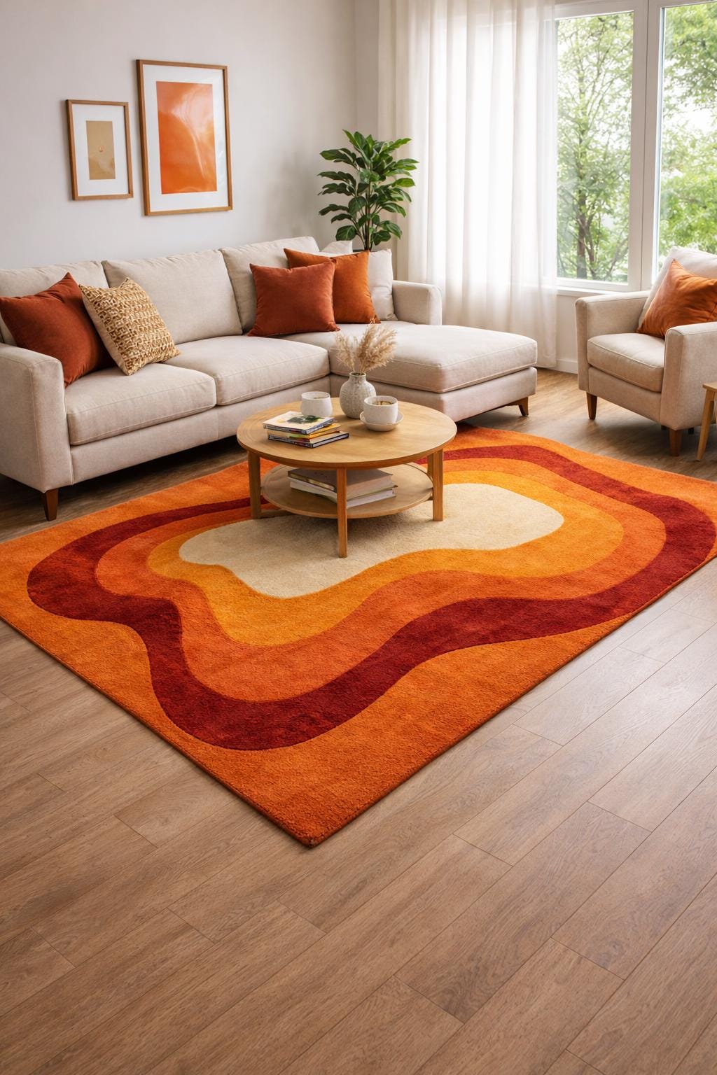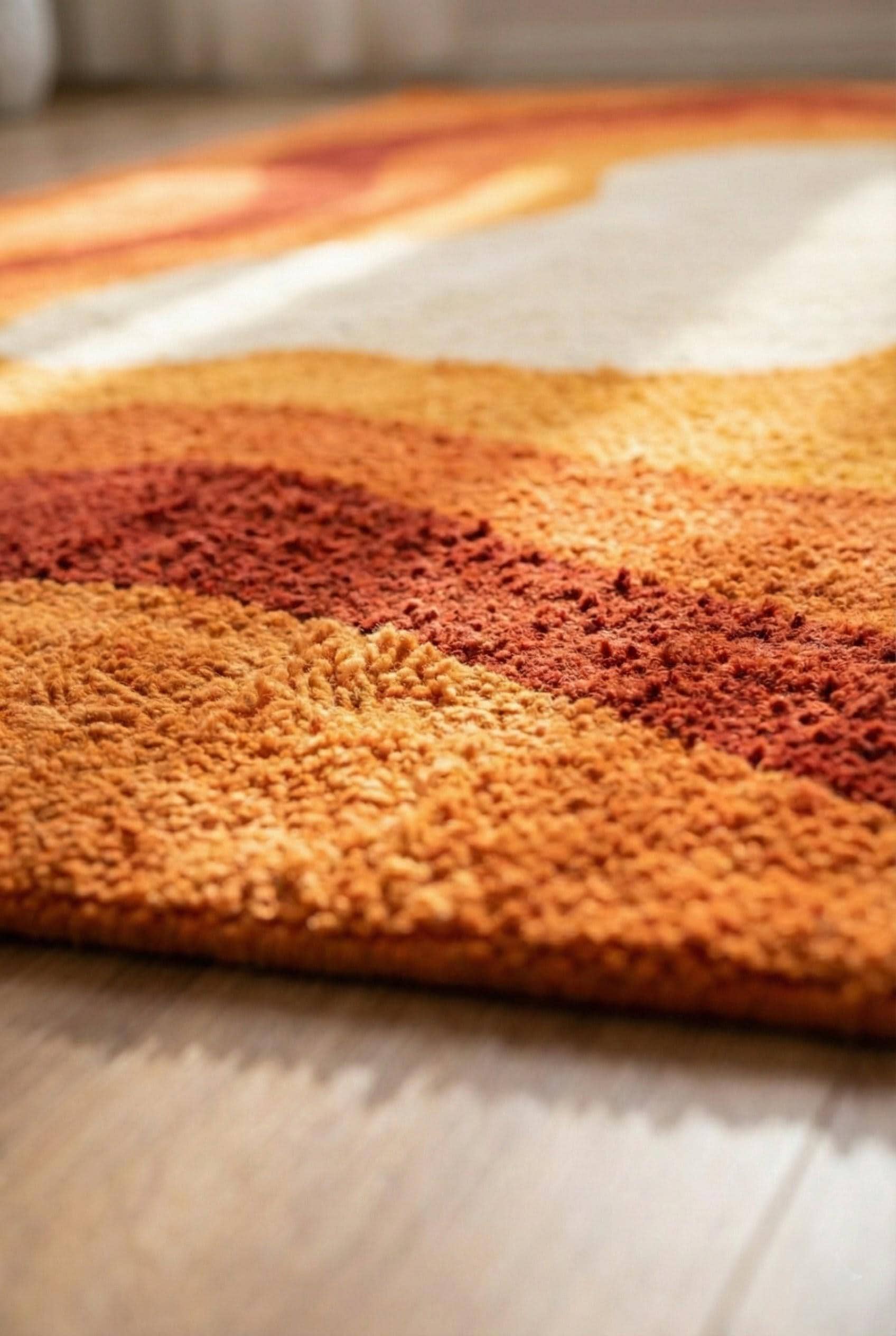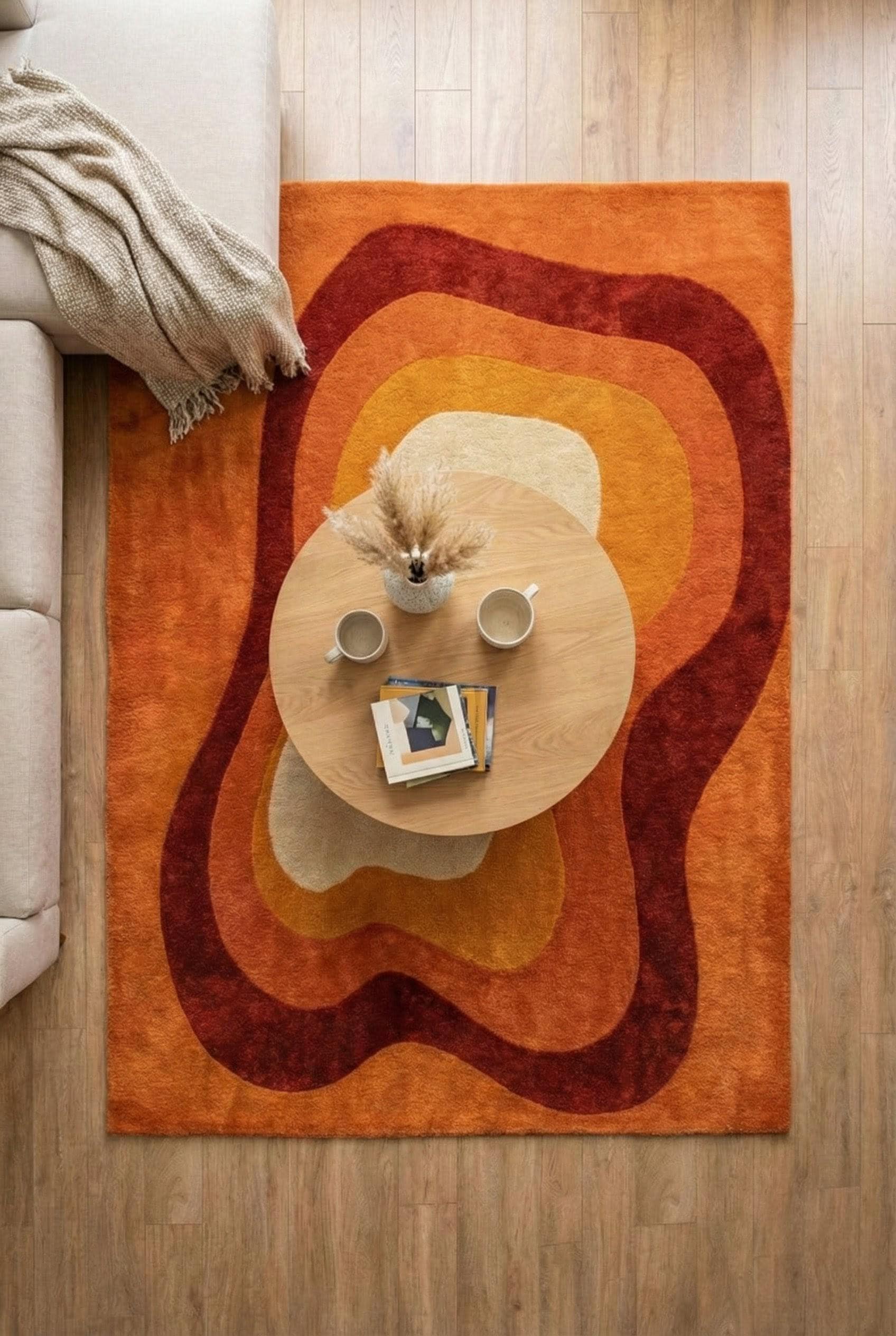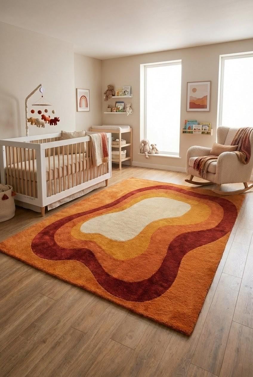 This rug is inspired by mid-century modern art and organic architecture, where form flows freely and color tells a story. The layered, wavy contours echo retro 1970s interiors while remaining timeless and modern. Warm terracotta, rust, amber, and soft ivory melt into one another, creating a visual rhythm that feels both calming and bold. This is not a flat graphic — it’s a sculpted artwork for your floor, designed to anchor your space with warmth and character.
