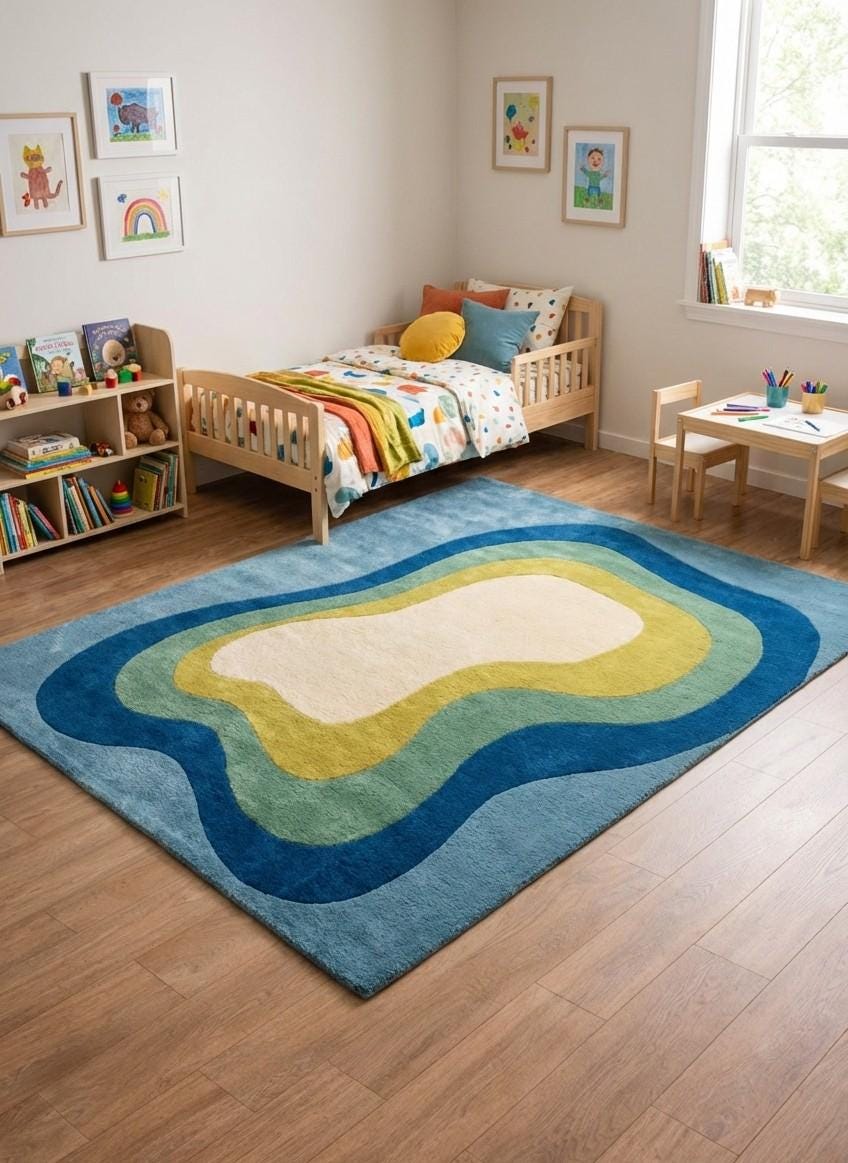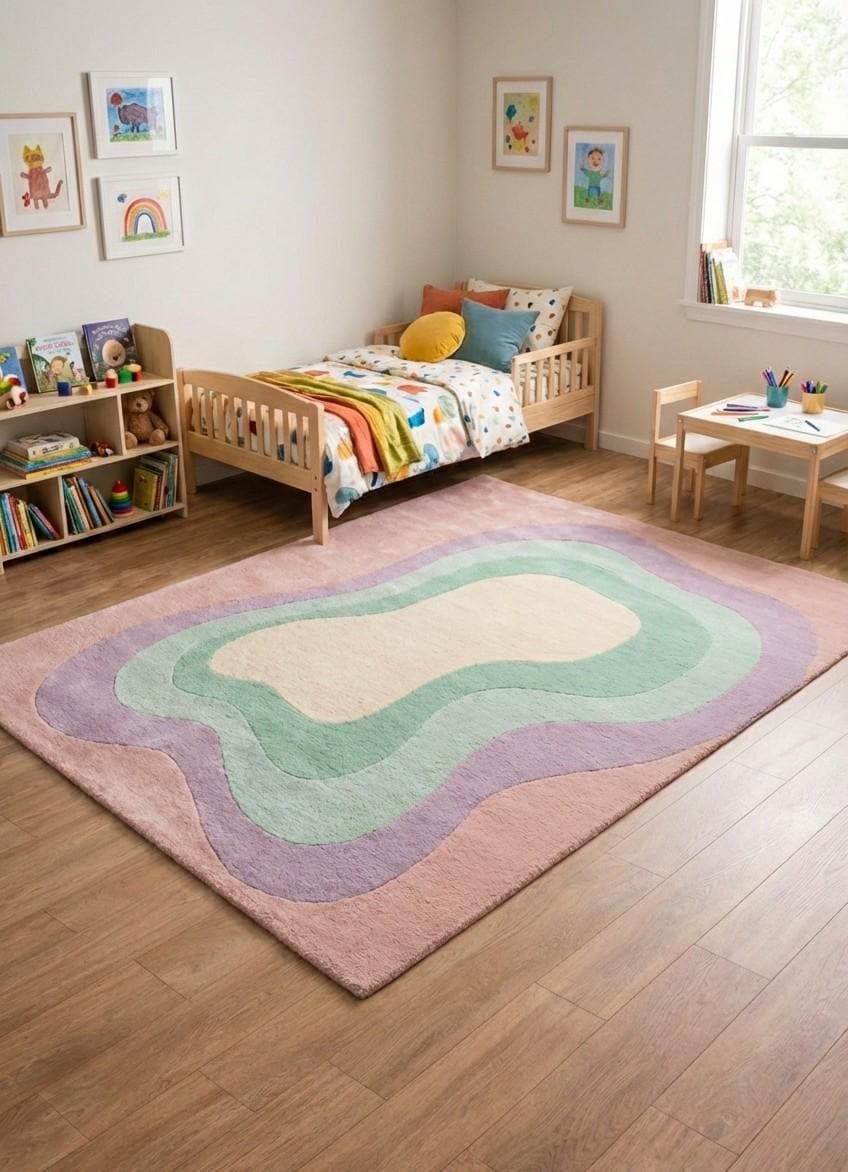 This rug is ideal for living rooms, bedrooms, nurseries, creative studios, and modern offices. Pair it with neutral sofas, light wood furniture, boucle chairs, or linen textures to let the colors glow. It works beautifully in Scandinavian, boho, mid-century, and modern interiors, instantly elevating the room into a magazine-worthy space.