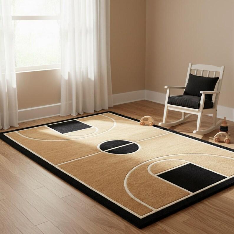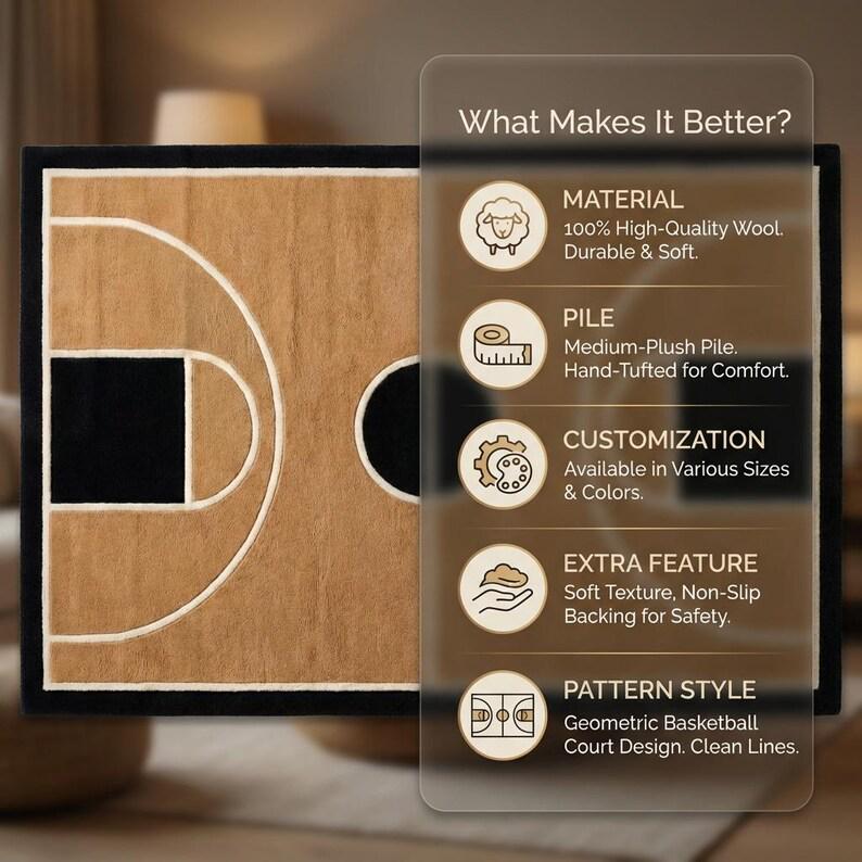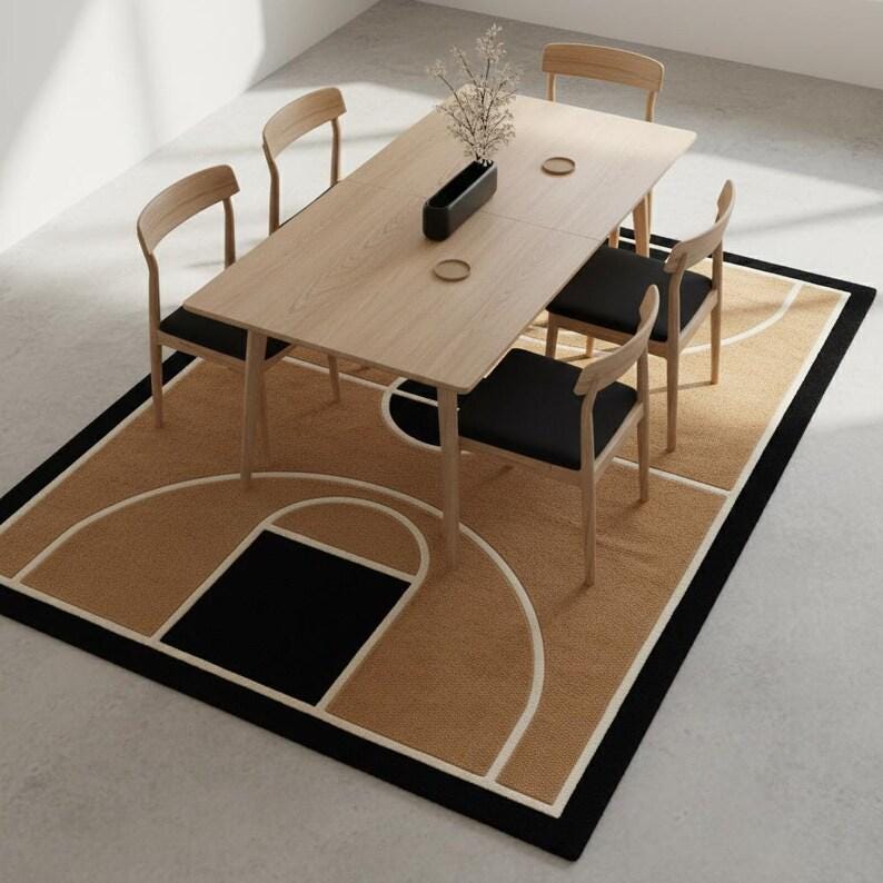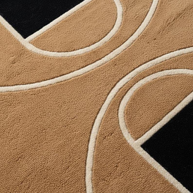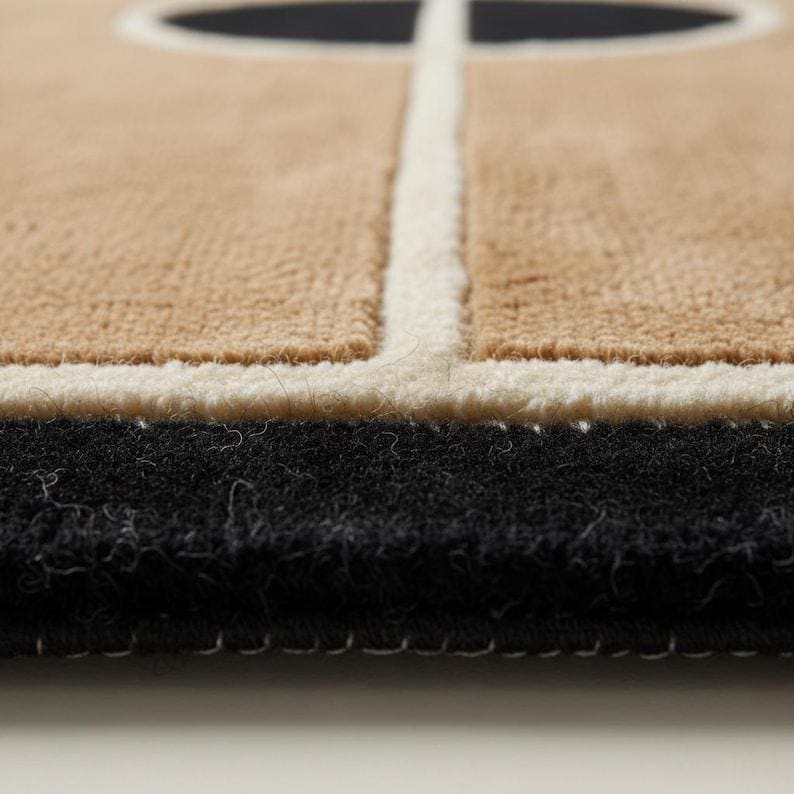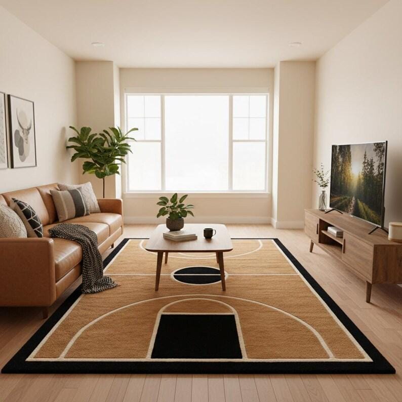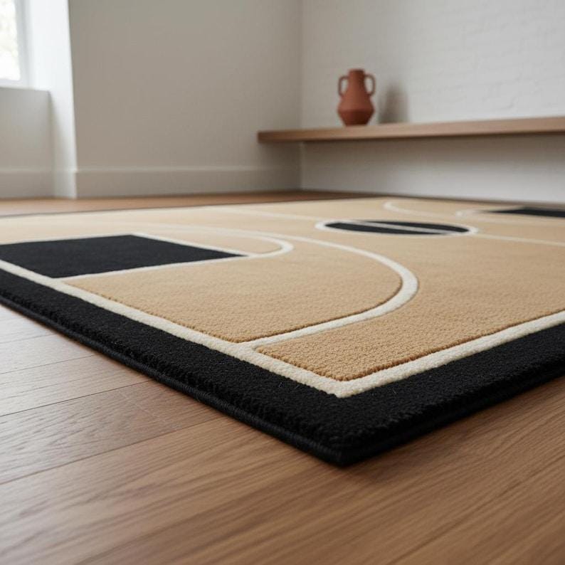 This rug is a celebration of clean geometry, architectural symmetry, and mid-century modern elegance. Inspired by the graphic layout of a basketball court, the design transforms bold lines and curves into a refined interior statement. The warm tan background creates an inviting foundation, while deep black accents and soft ivory outlines add contrast, depth, and visual rhythm. Every line is intentionally placed, creating a sense of balance that feels modern yet timeless — perfect for design-forward homes that appreciate art underfoot.