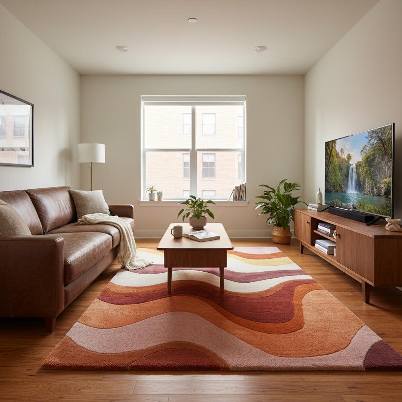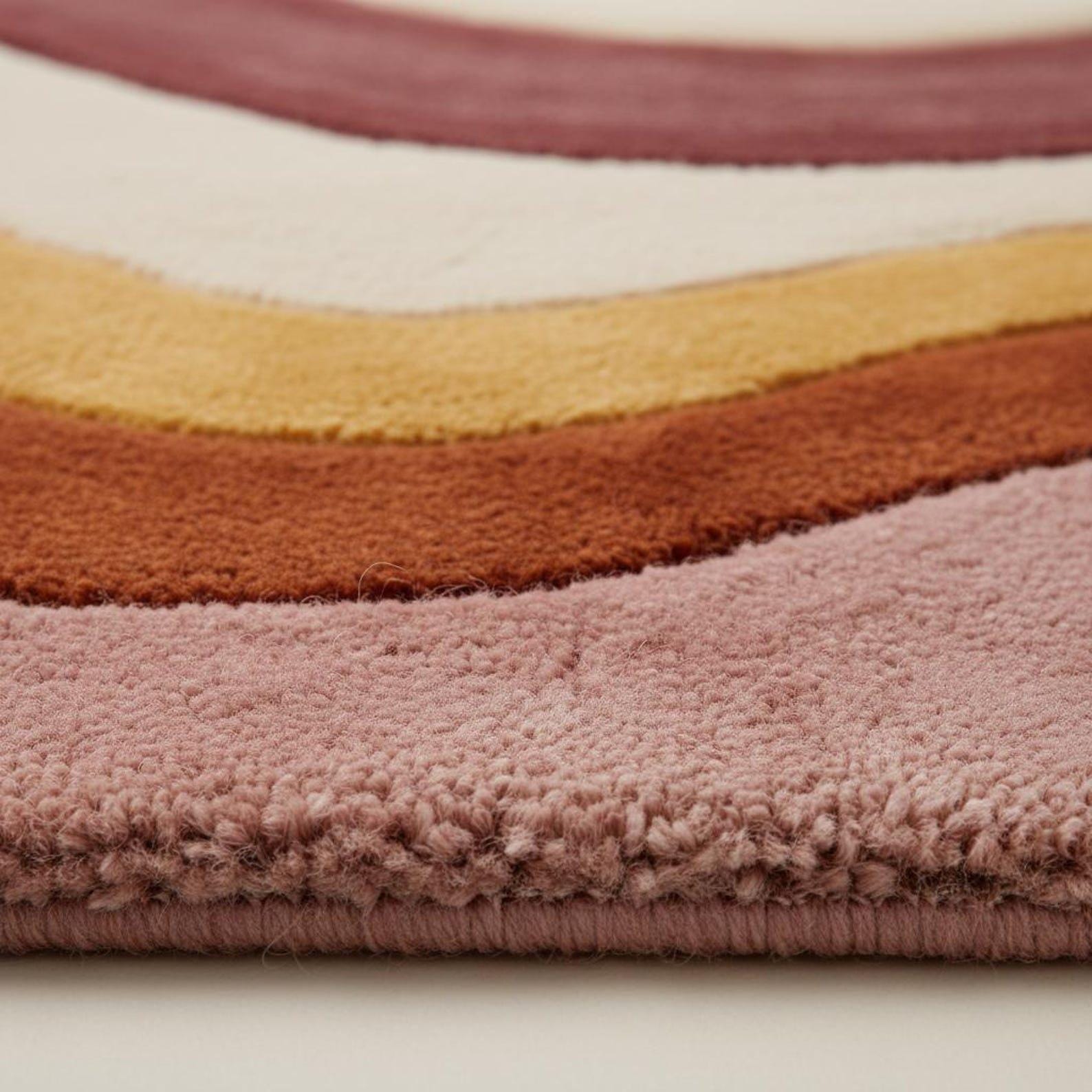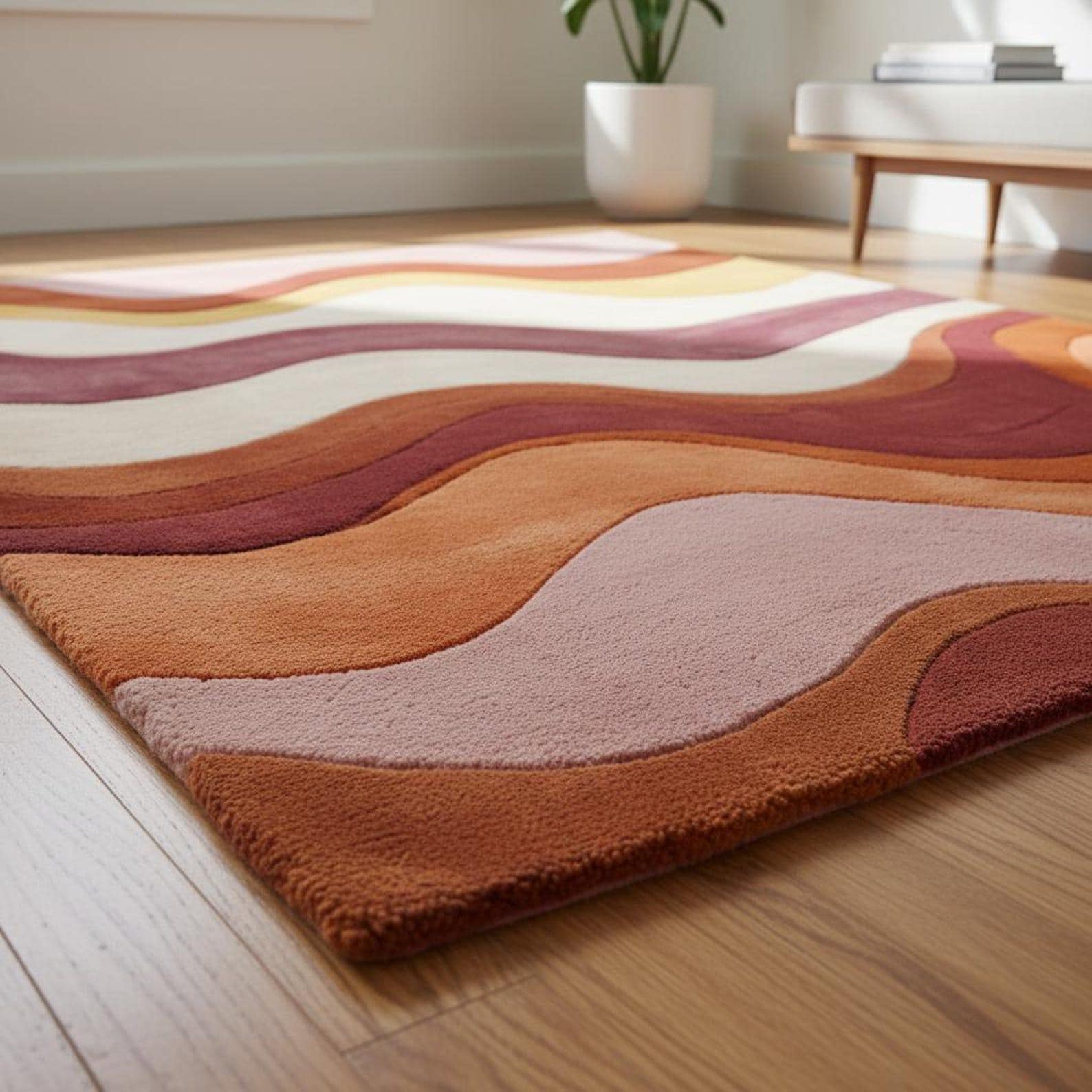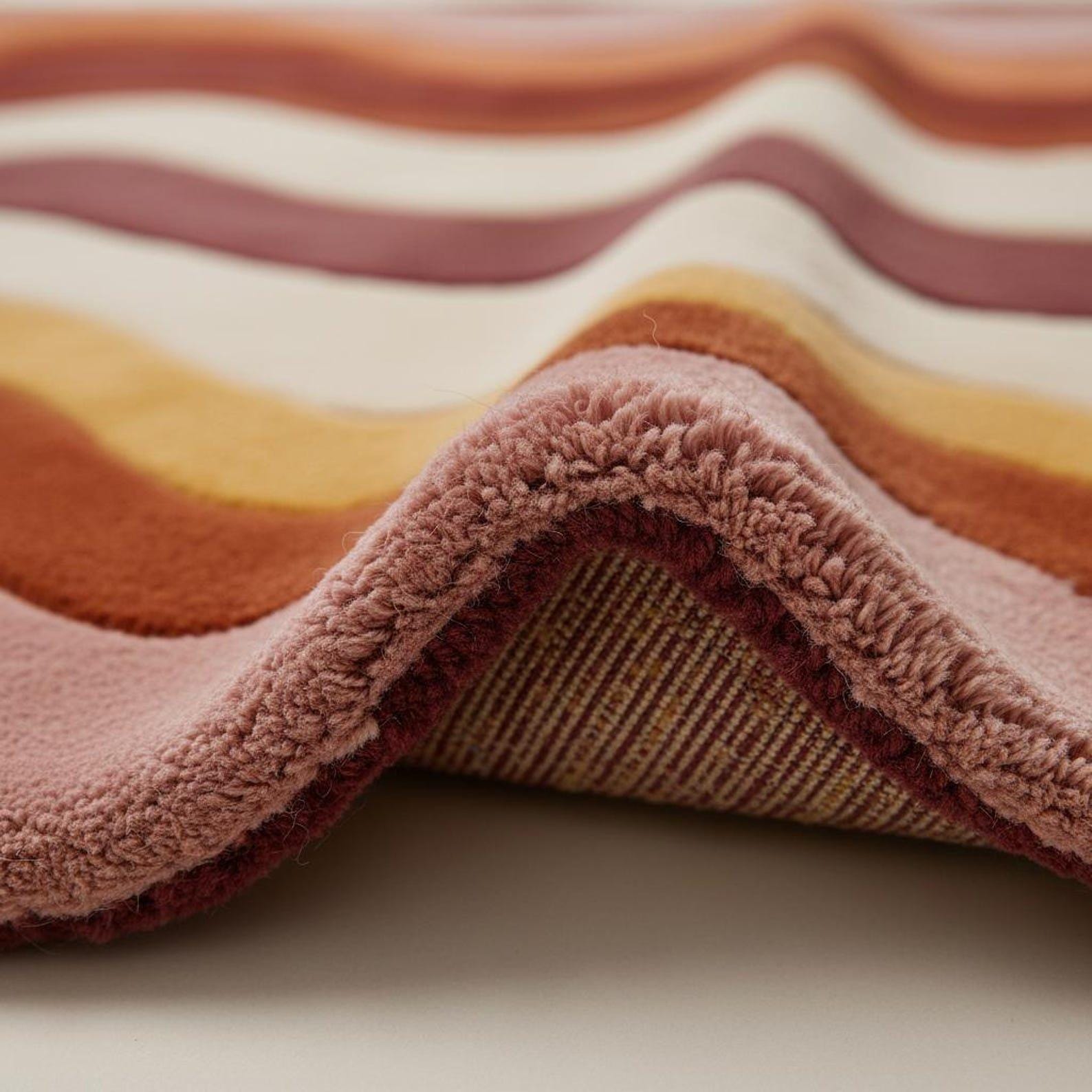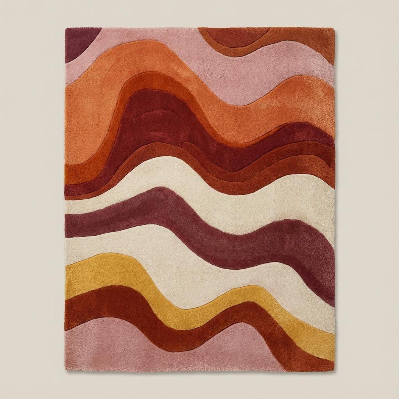 This rug is inspired by retro wave art and mid-century abstraction, where flowing lines and layered color bands create a sense of movement and harmony. Soft curves ripple across the surface, blending blush pink, warm terracotta, rust, mustard, and creamy ivory into a balanced, soothing composition. The design feels organic and intentional — bold enough to stand alone as a statement piece, yet refined enough to anchor a thoughtfully styled interior. Each color transition is carefully sculpted, giving the rug a dimensional, gallery-worthy presence.