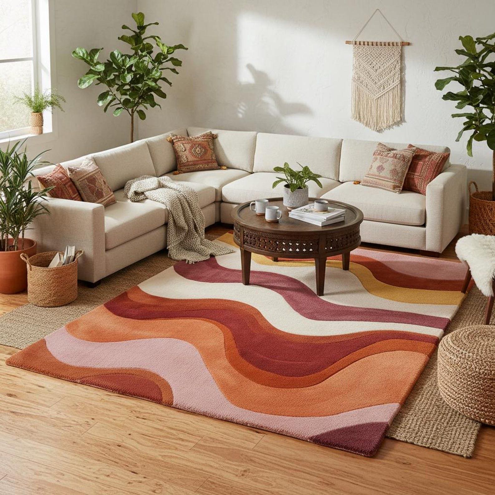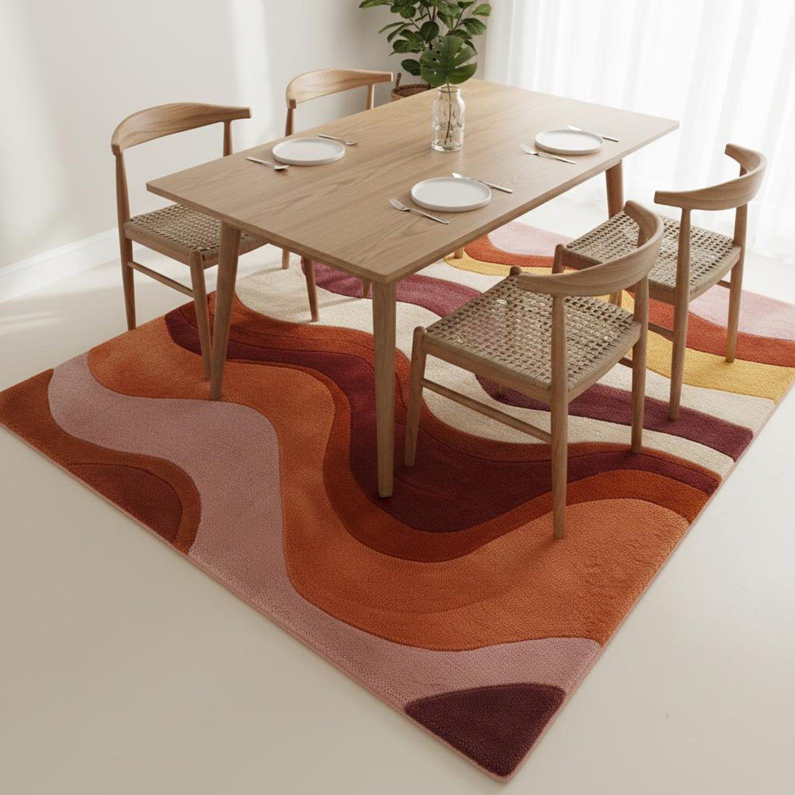 Hand Tufted Wool Area Rug Mid Century Retro Wave Abstract Design Terracotta Blush Cozy Modern Living Room Carpet 8x10 9x12 Custom