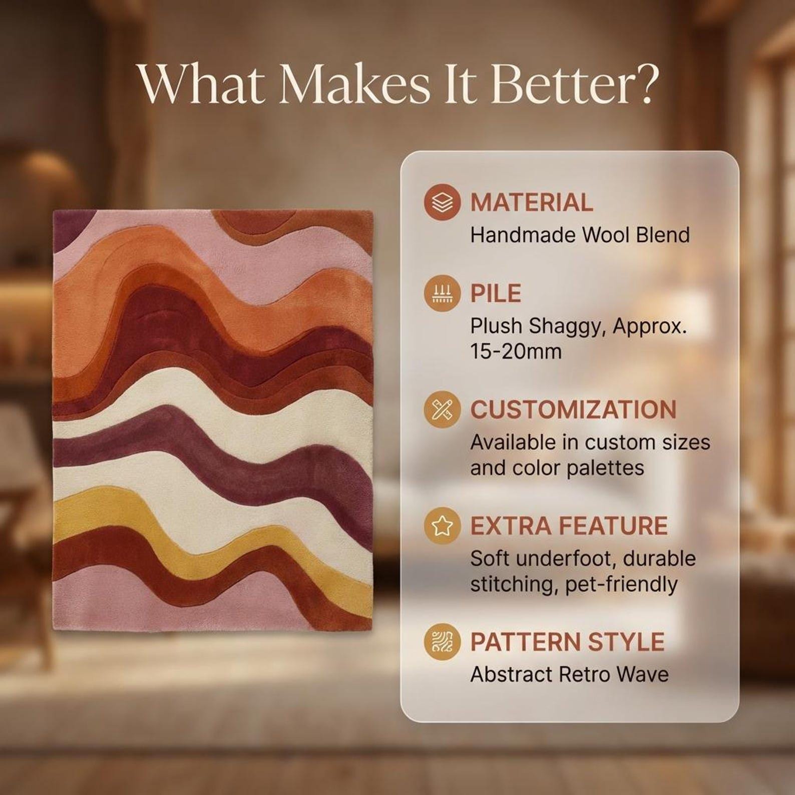 This rug is ideal for living rooms, bedrooms, dining spaces, creative studios, and reading nooks. Pair it with neutral sofas, wooden furniture, cane or rattan accents, and warm metals to let the colors shine. It complements mid-century, boho, modern, and eclectic interiors beautifully, adding warmth without overpowering the room.