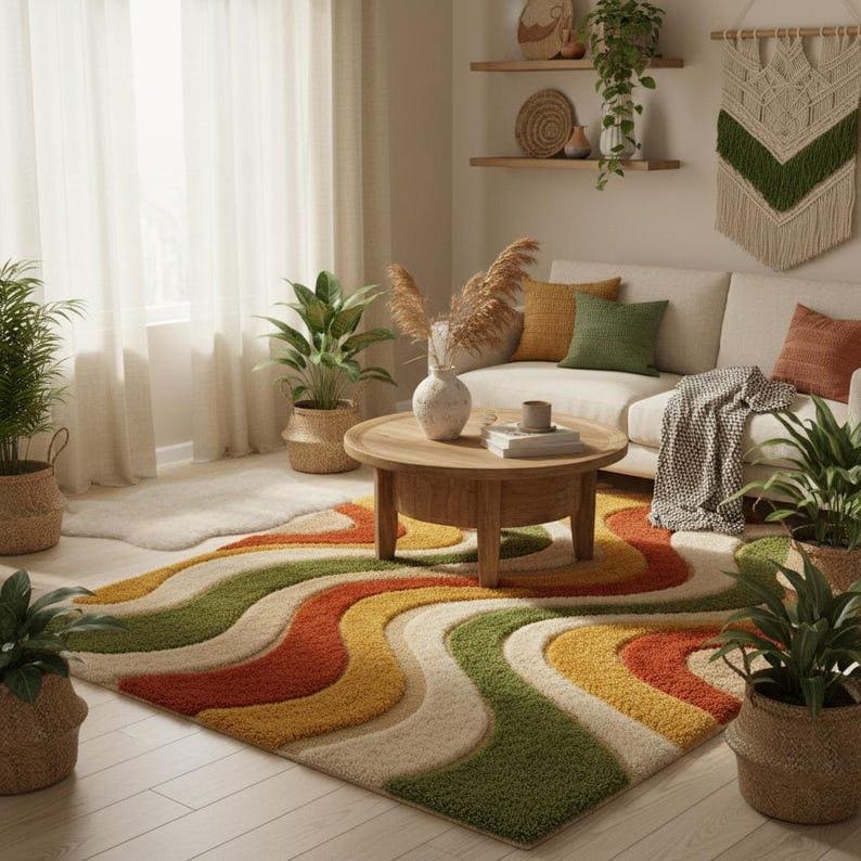 This rug is perfect for living rooms, bedrooms, nurseries, creative studios, and cozy lounges. It pairs beautifully with mid-century furniture, light or dark wood tones, neutral sofas, woven accents, and warm metals. Whether styled in a boho-modern home or a retro-inspired interior, it anchors the room with warmth and personality.