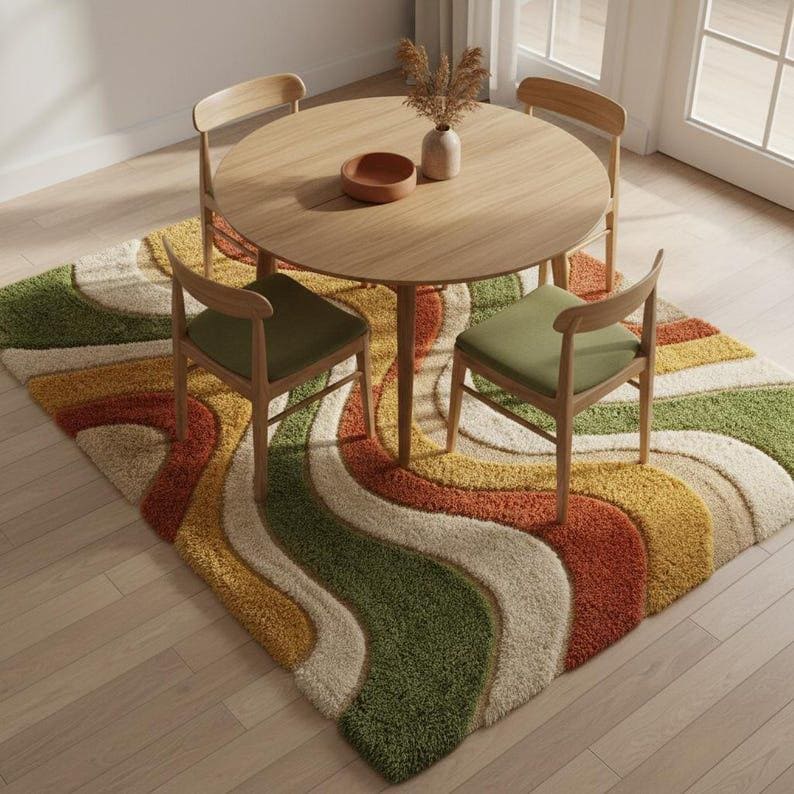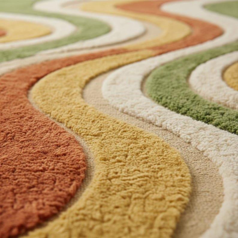 This rug is inspired by retro mid-century wave art, where soft movement and earthy color harmony create a sense of calm sophistication. The flowing, sculptural lines move effortlessly across the surface, blending olive green, mustard yellow, burnt orange, terracotta, and creamy ivory into a balanced visual rhythm. The design feels organic and grounded, echoing nature’s curves while embracing the bold confidence of vintage modern interiors. Each wave is intentionally carved to create depth, making the rug feel more like a textile artwork than a simple floor covering.