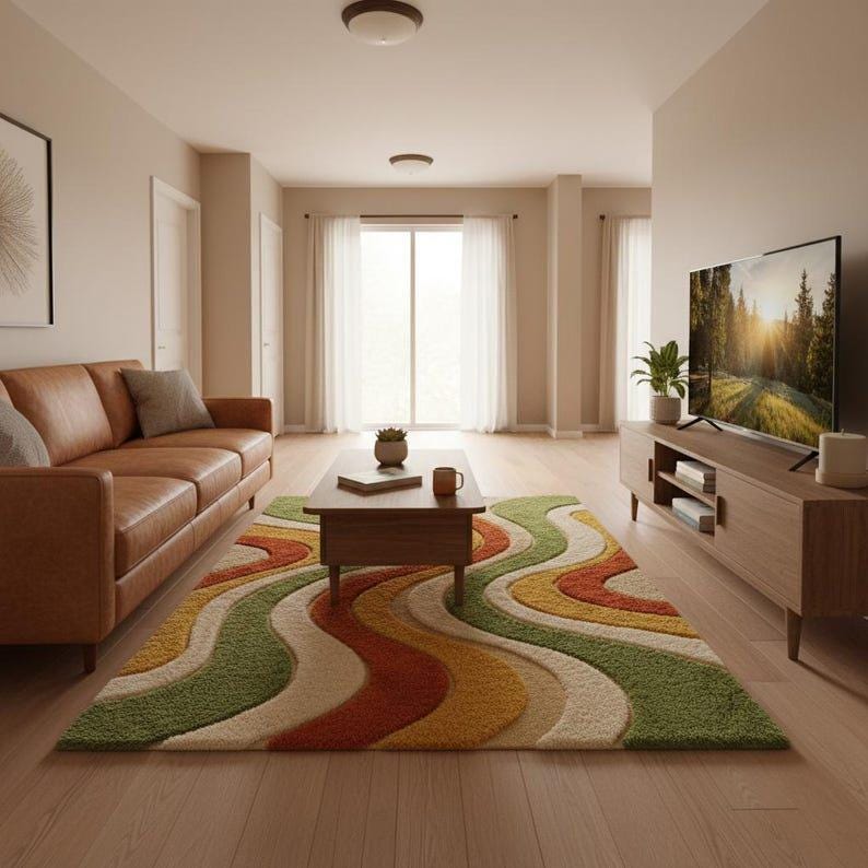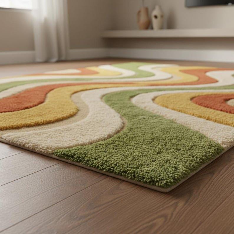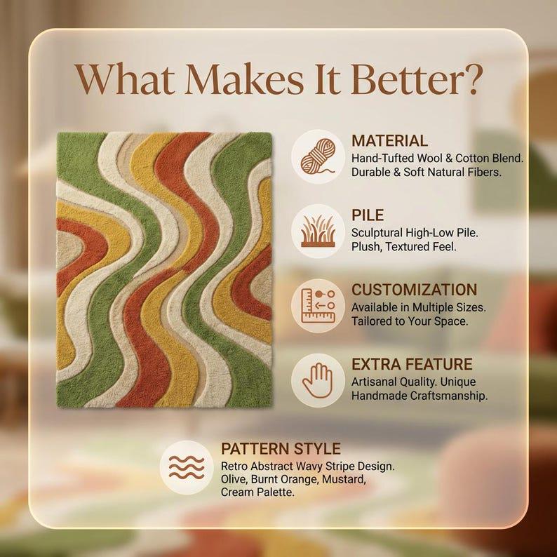 🌟Hand Tufted Wool Area Rug Mid Century Retro Wavy Design Olive Mustard Burnt Orange Plush Modern Living Room Carpet 8x10 9x12 Custom🌟