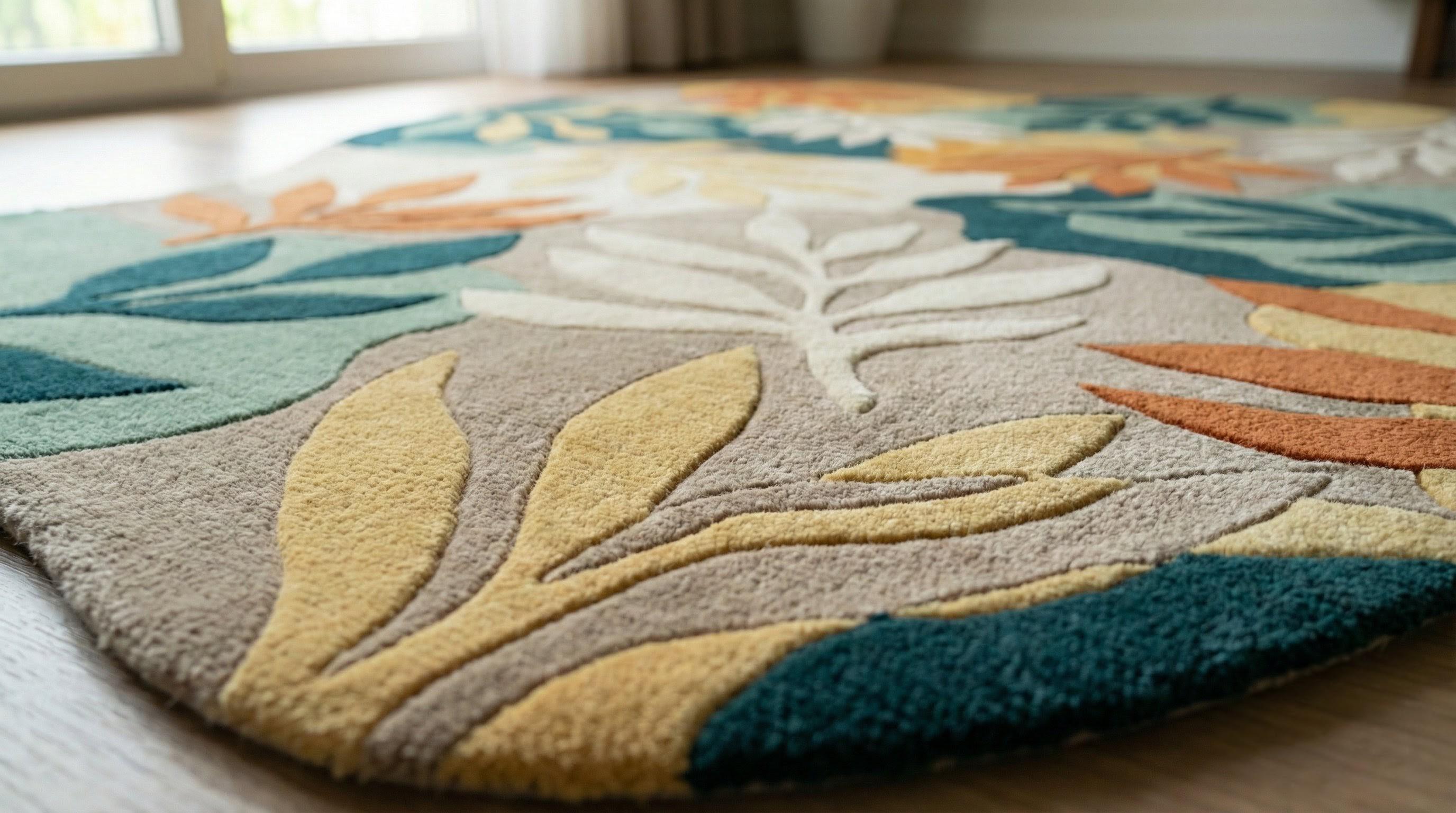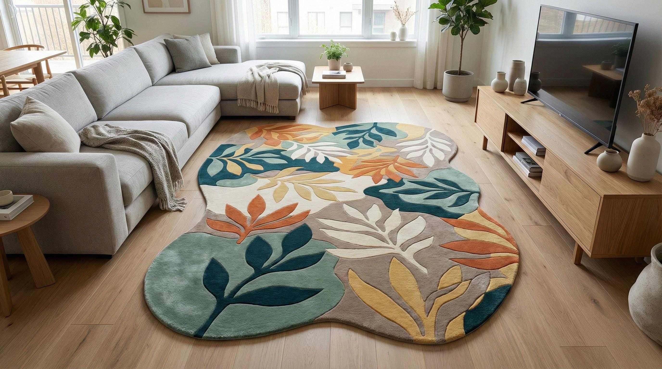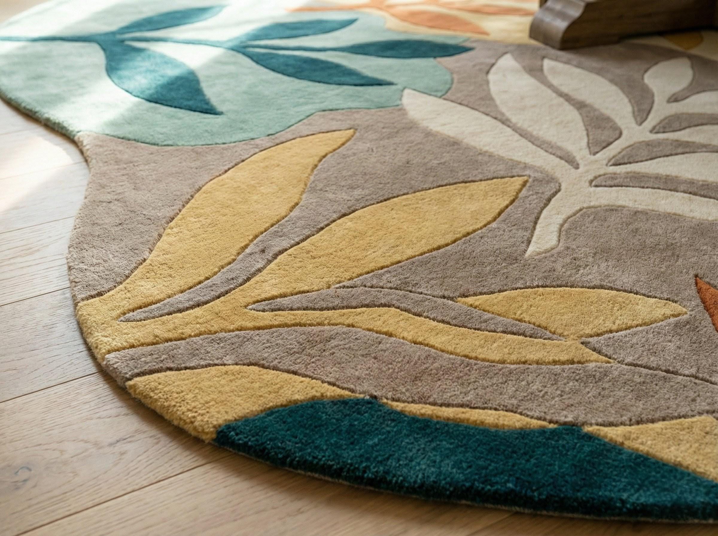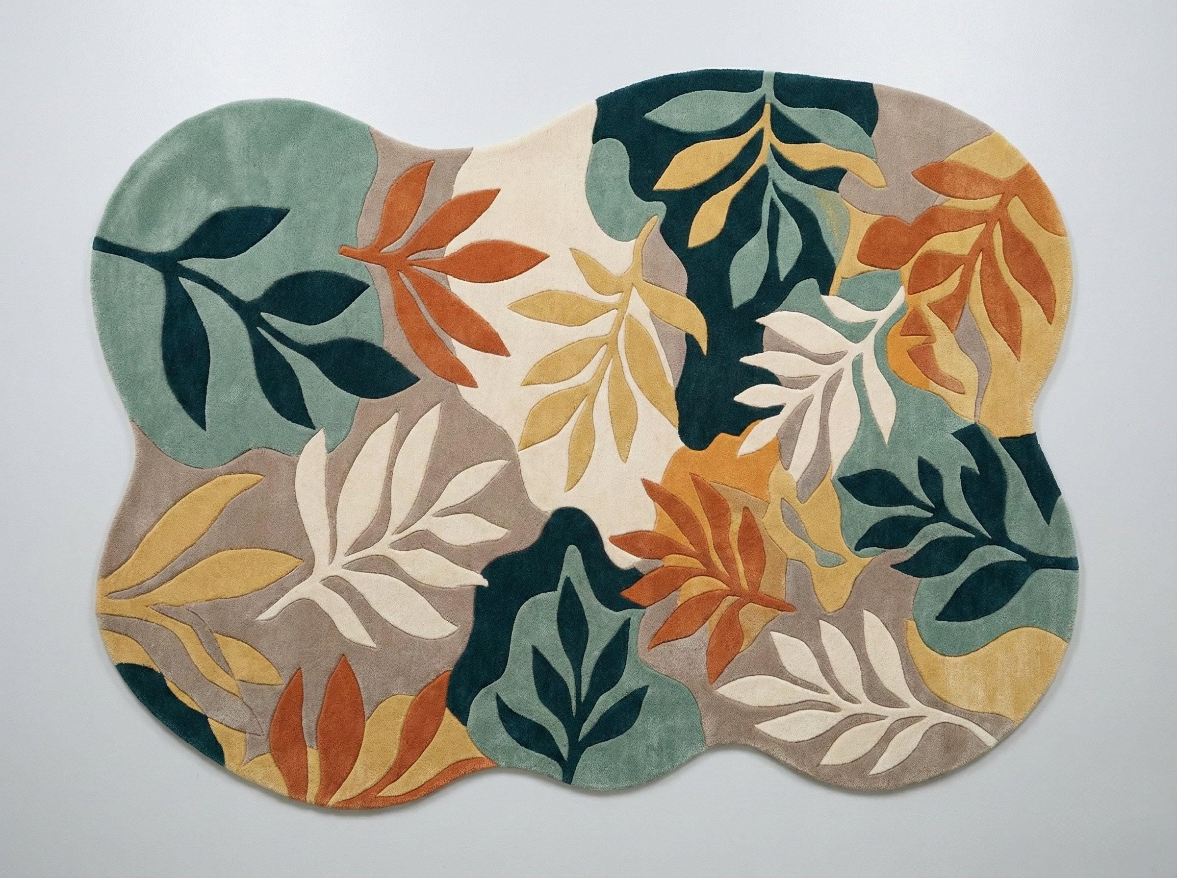 Inspired by organic botanical forms and mid-century modern artistry, this rug features flowing leaf motifs carved into an irregular, sculptural silhouette. The layered color palette of sage green, teal, ivory, mustard, and warm terracotta is carefully balanced to feel grounded yet expressive. Each curve and contour mimics natural movement — like leaves drifting across a serene forest floor — making the rug feel more like a functional art piece than a floor covering. This design pairs beautifully with modern, bohemian, Scandinavian, and organic interiors.