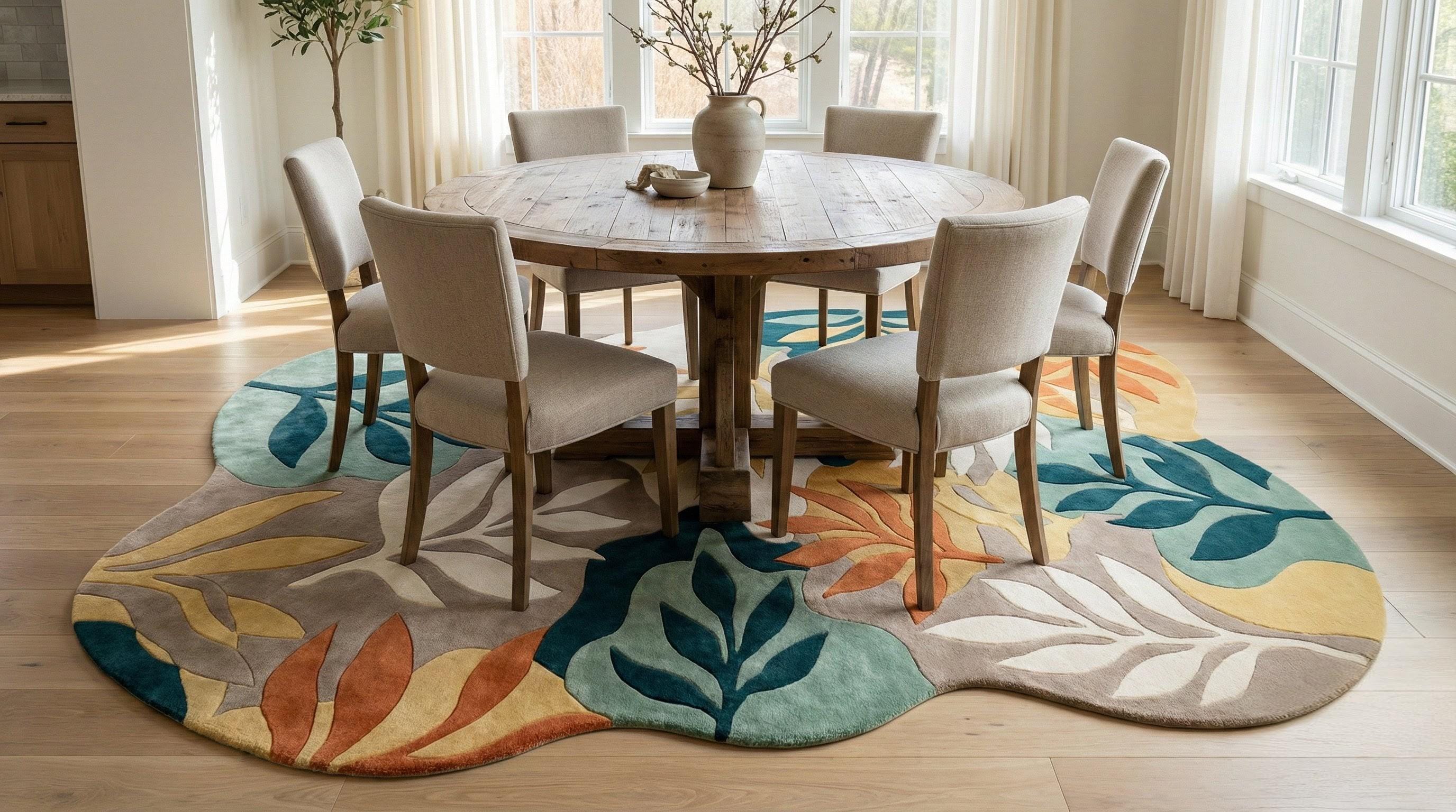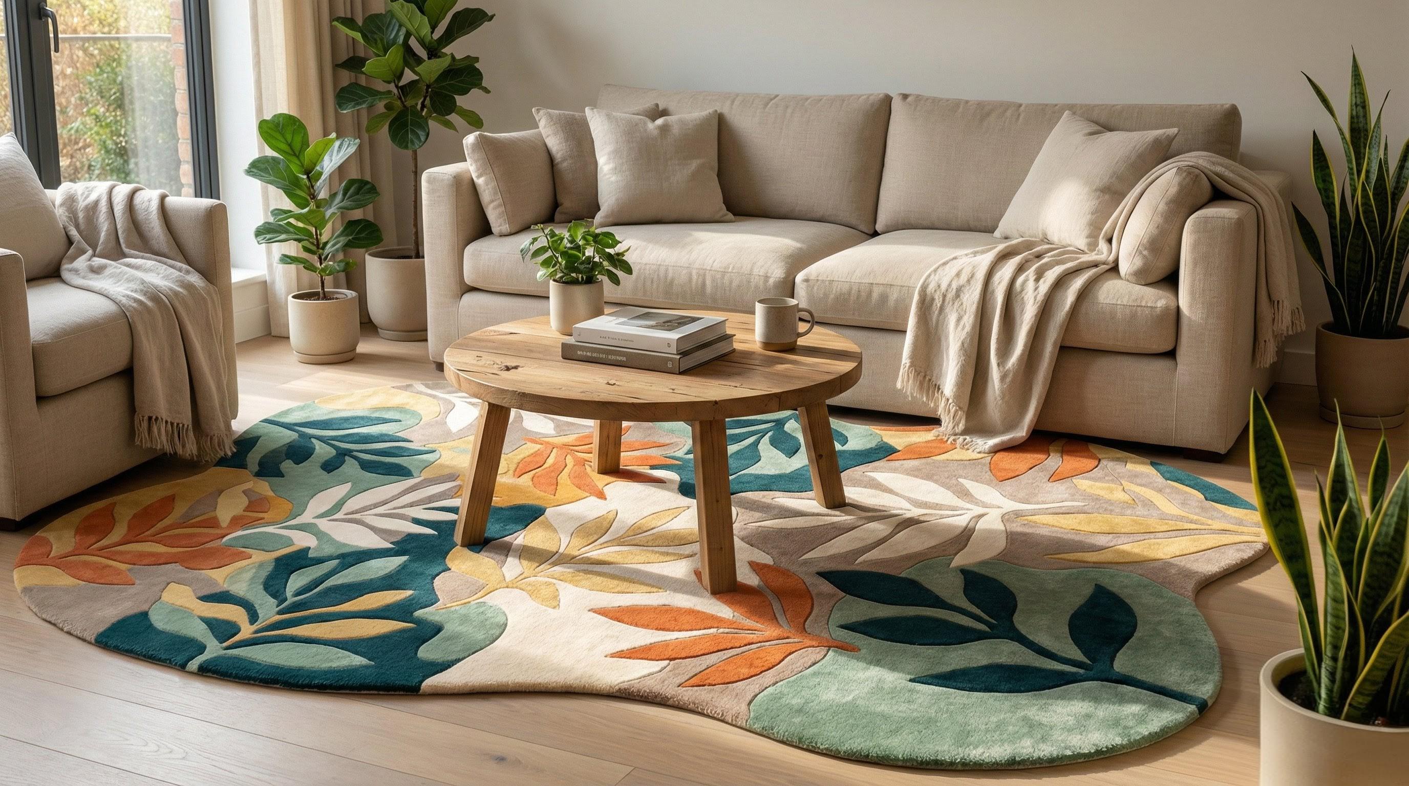 Perfect for living rooms, bedrooms, dining areas, or creative studios, this rug pairs beautifully with light wood furniture, neutral sofas, linen upholstery, and indoor plants. The organic shape softens hard edges, making spaces feel warmer and more inviting. It works especially well in minimalist interiors where it can shine as the focal statement.