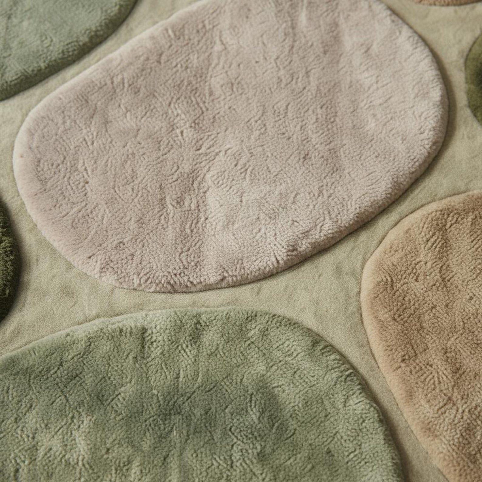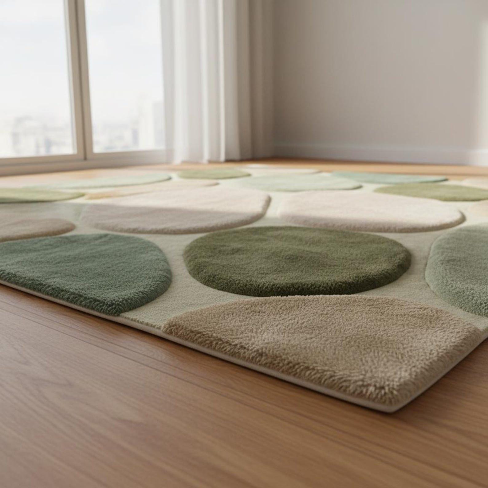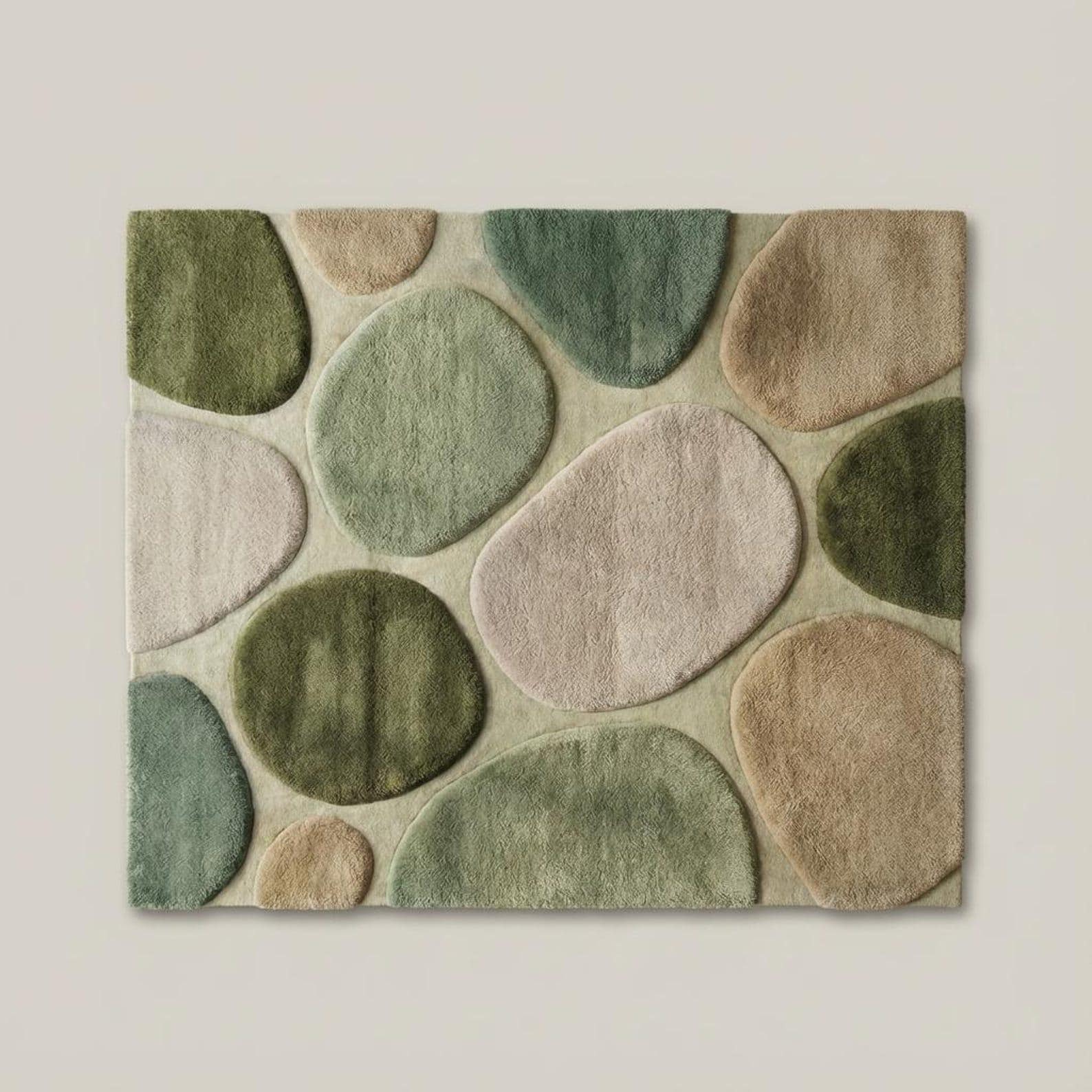 This rug is inspired by natural pebble formations, forest tones, and organic balance. Each rounded shape flows effortlessly into the next, creating a soothing visual rhythm that feels grounded and modern at the same time. The layered pebble design adds depth without clutter, making it perfect for minimal yet warm interiors. Muted greens, moss, beige, and ivory blend harmoniously, allowing the rug to anchor your space while still feeling light and breathable.