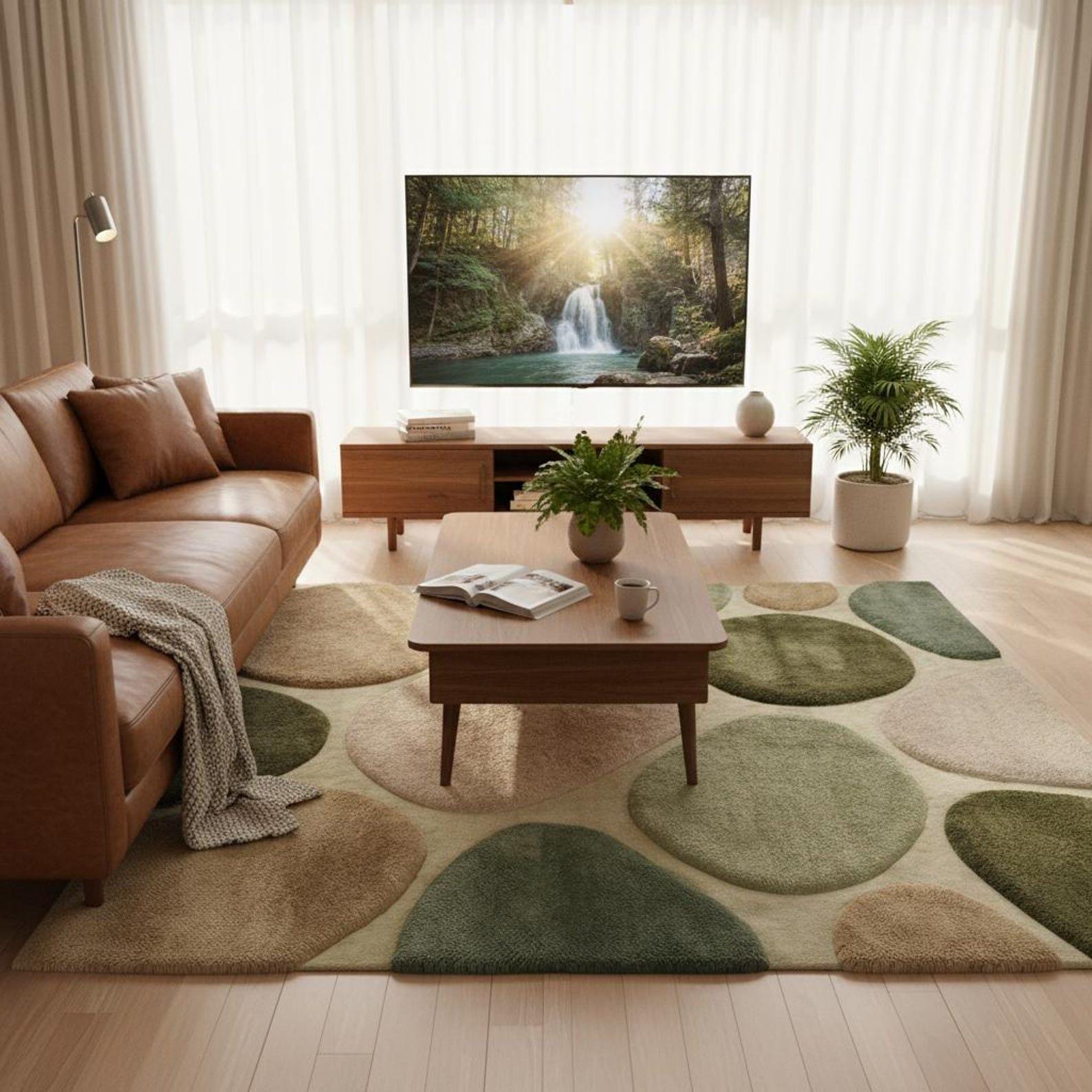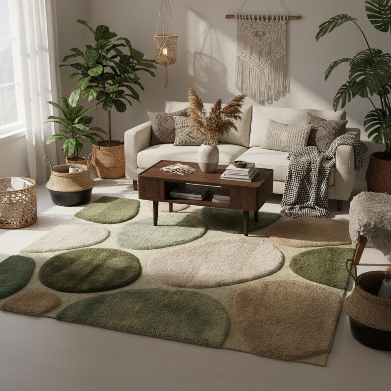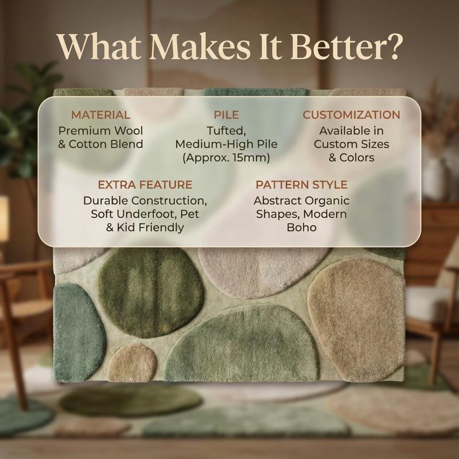 This rug is inspired by natural pebble formations, forest tones, and organic balance. Each rounded shape flows effortlessly into the next, creating a soothing visual rhythm that feels grounded and modern at the same time. The layered pebble design adds depth without clutter, making it perfect for minimal yet warm interiors. Muted greens, moss, beige, and ivory blend harmoniously, allowing the rug to anchor your space while still feeling light and breathable.
