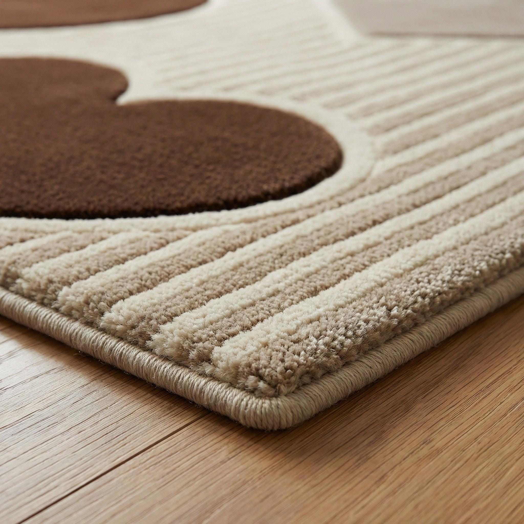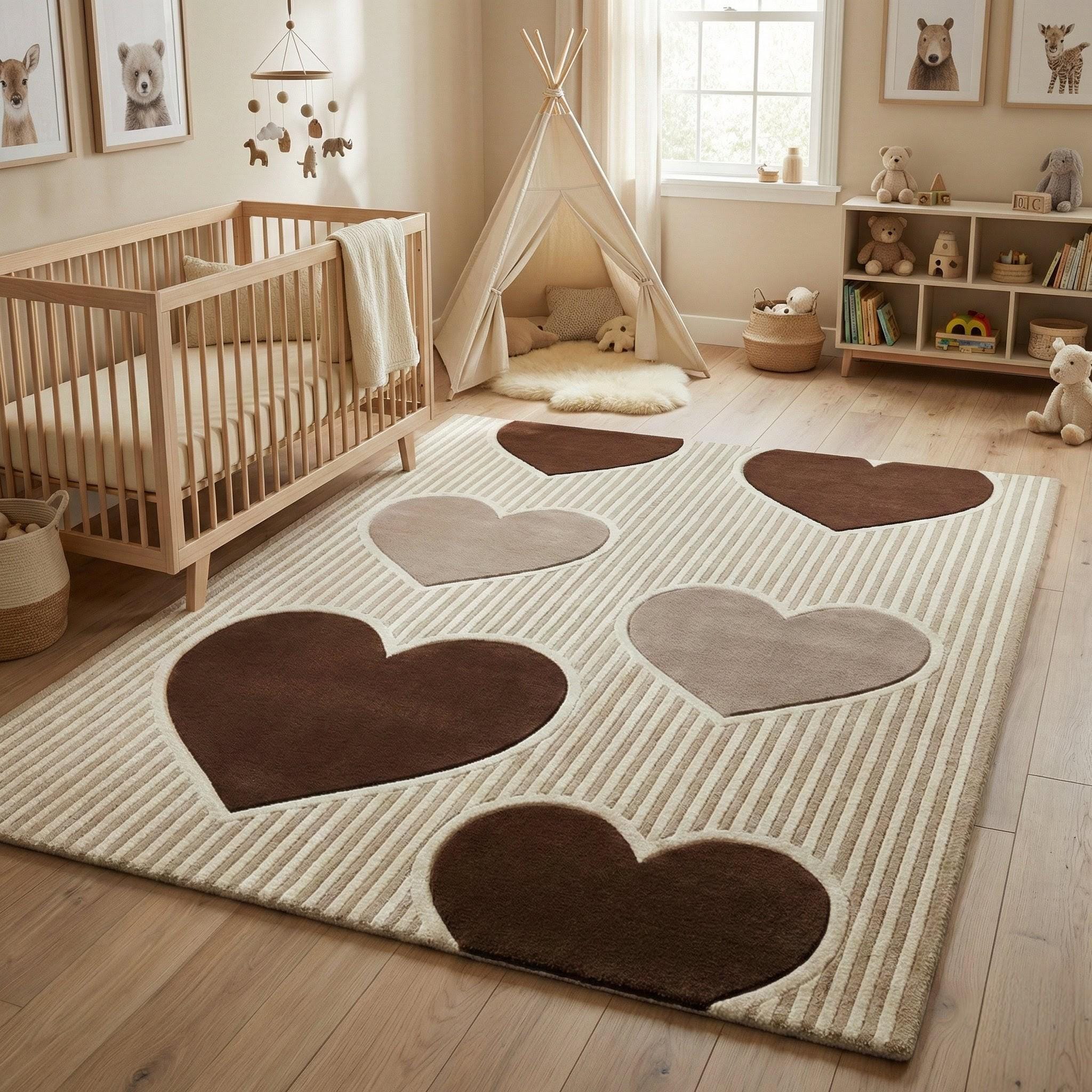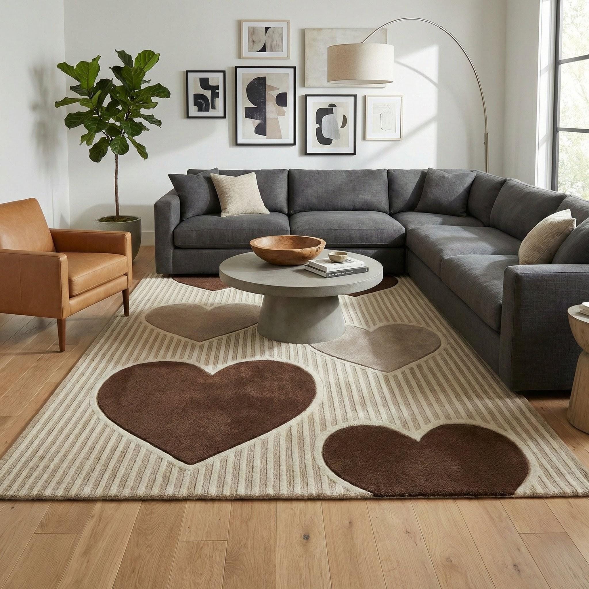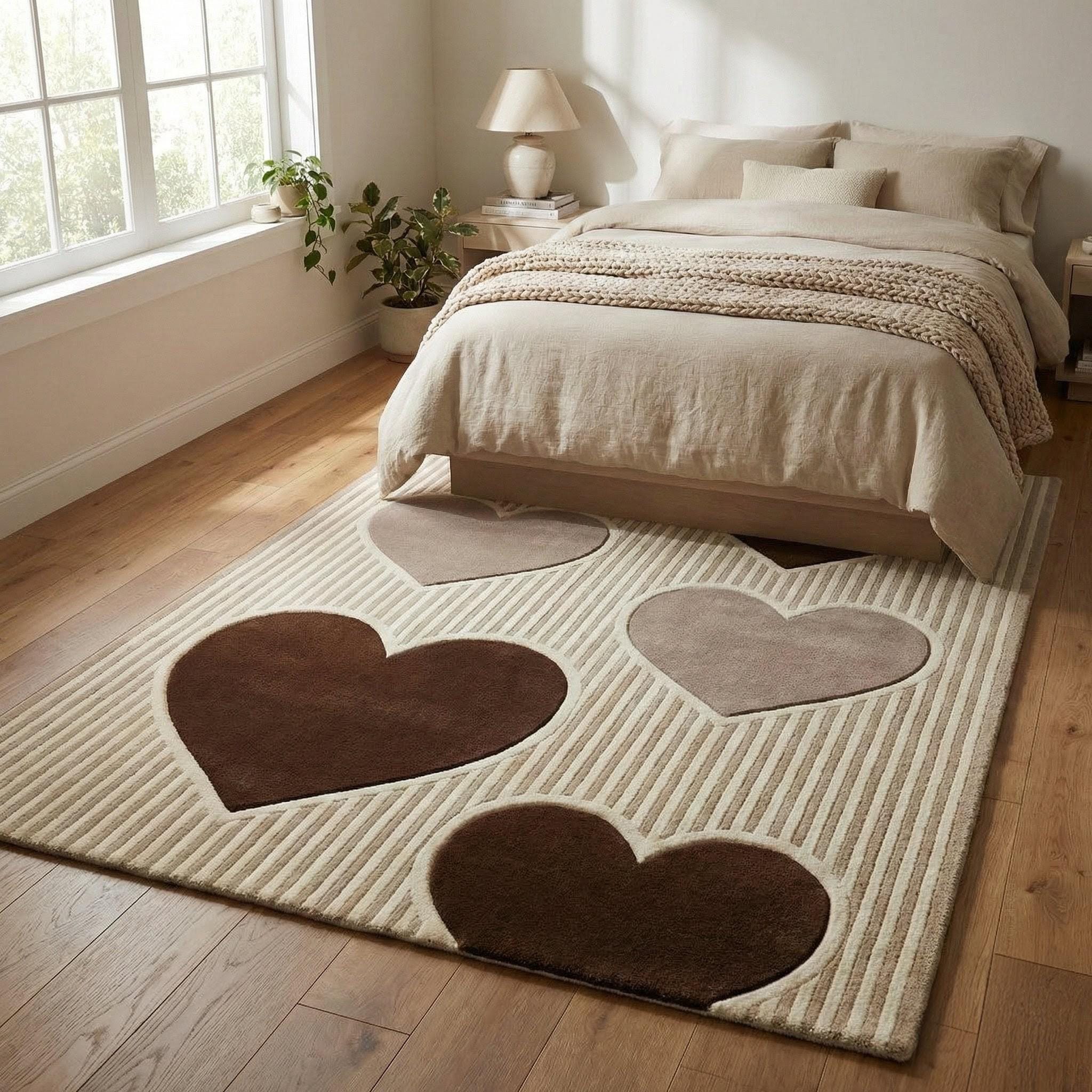 This heart-patterned area rug is a celebration of softness, warmth, and modern romance. Designed with an organic layout of oversized hearts, the composition feels playful yet refined — never childish, always tasteful. The creamy ivory base is gently ribbed with linear texture, creating movement and depth, while the raised heart motifs in chocolate brown and muted taupe bring visual balance and calm contrast. The result is a rug that feels both contemporary and emotionally inviting, blending Scandinavian simplicity with cozy modern design.