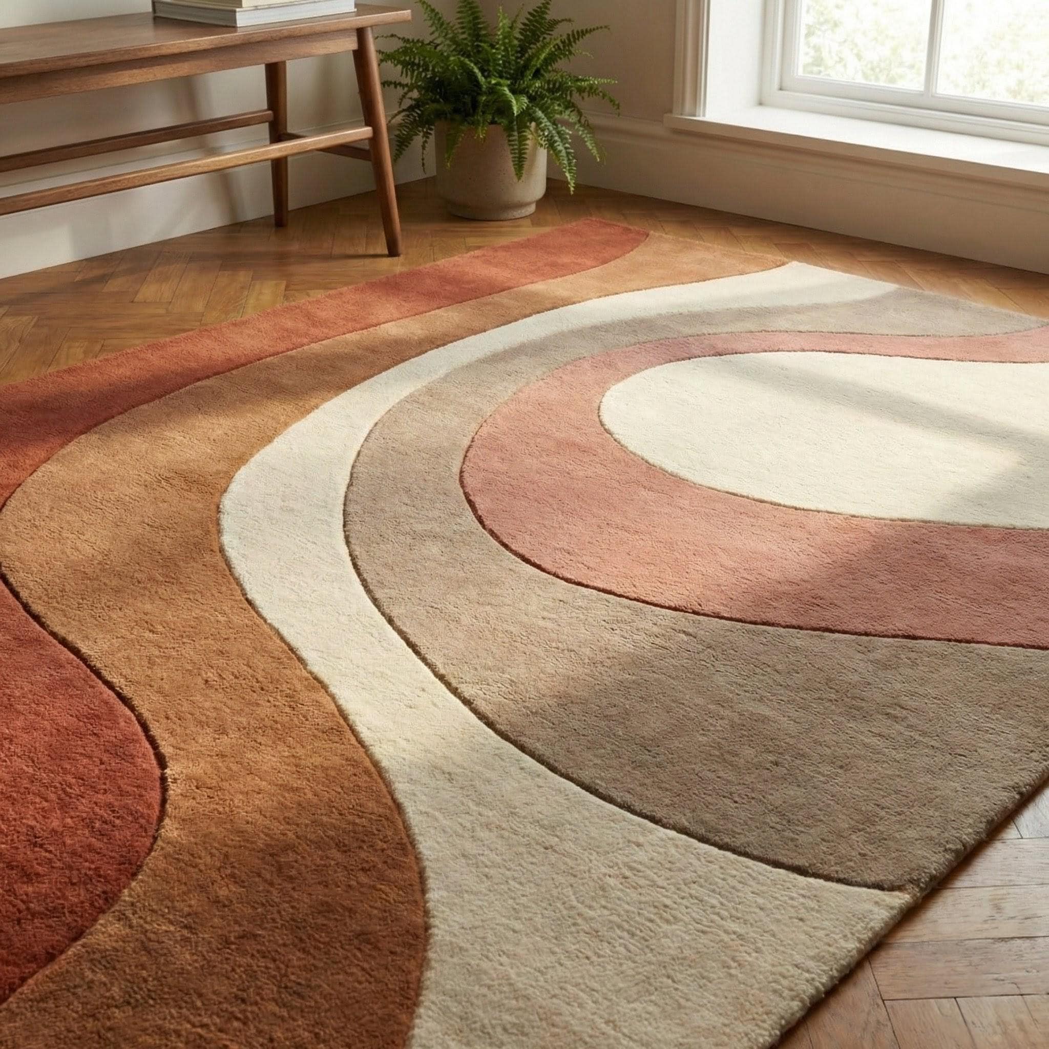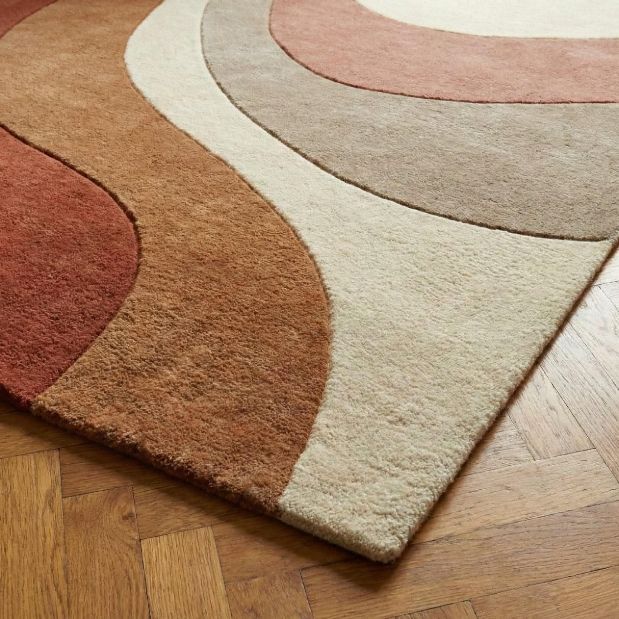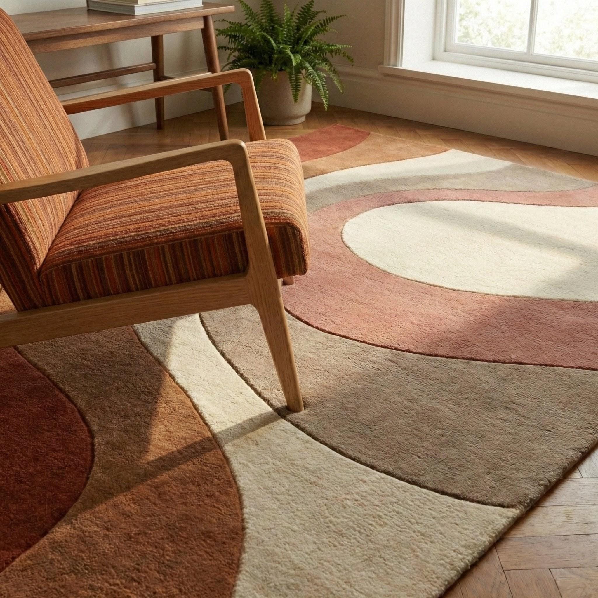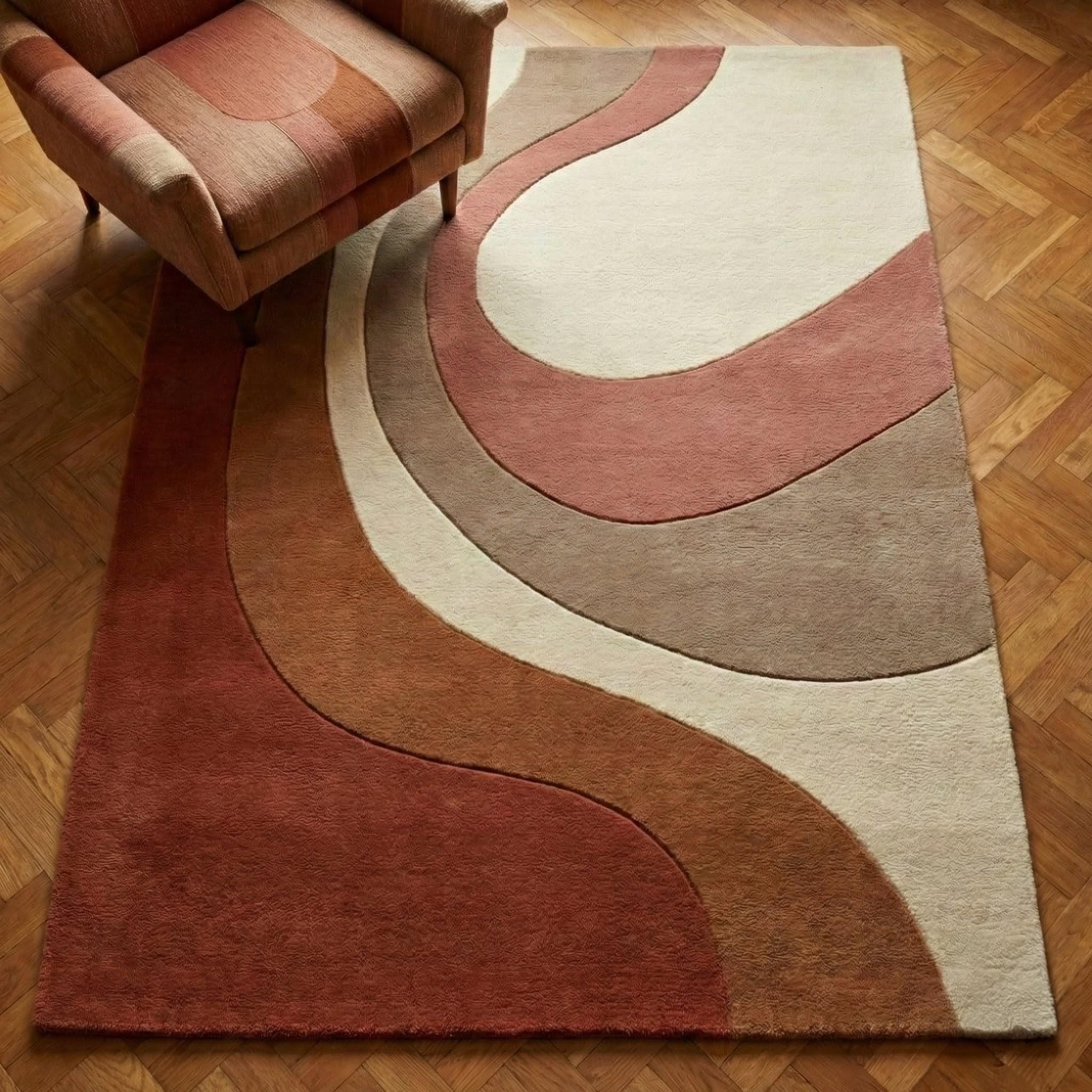 This modern abstract rug is a celebration of organic movement and timeless mid-century design. Flowing, sculptural curves ripple across the surface, creating a sense of calm rhythm and visual balance. Inspired by retro architecture and soft desert landscapes, the palette blends terracotta rust, warm caramel browns, muted taupe, and creamy ivory, making it both expressive and grounding. The design feels artistic yet approachable — bold enough to anchor a room, subtle enough to live with for years. Every curve is intentional, guiding the eye naturally through the space while adding depth without visual noise.