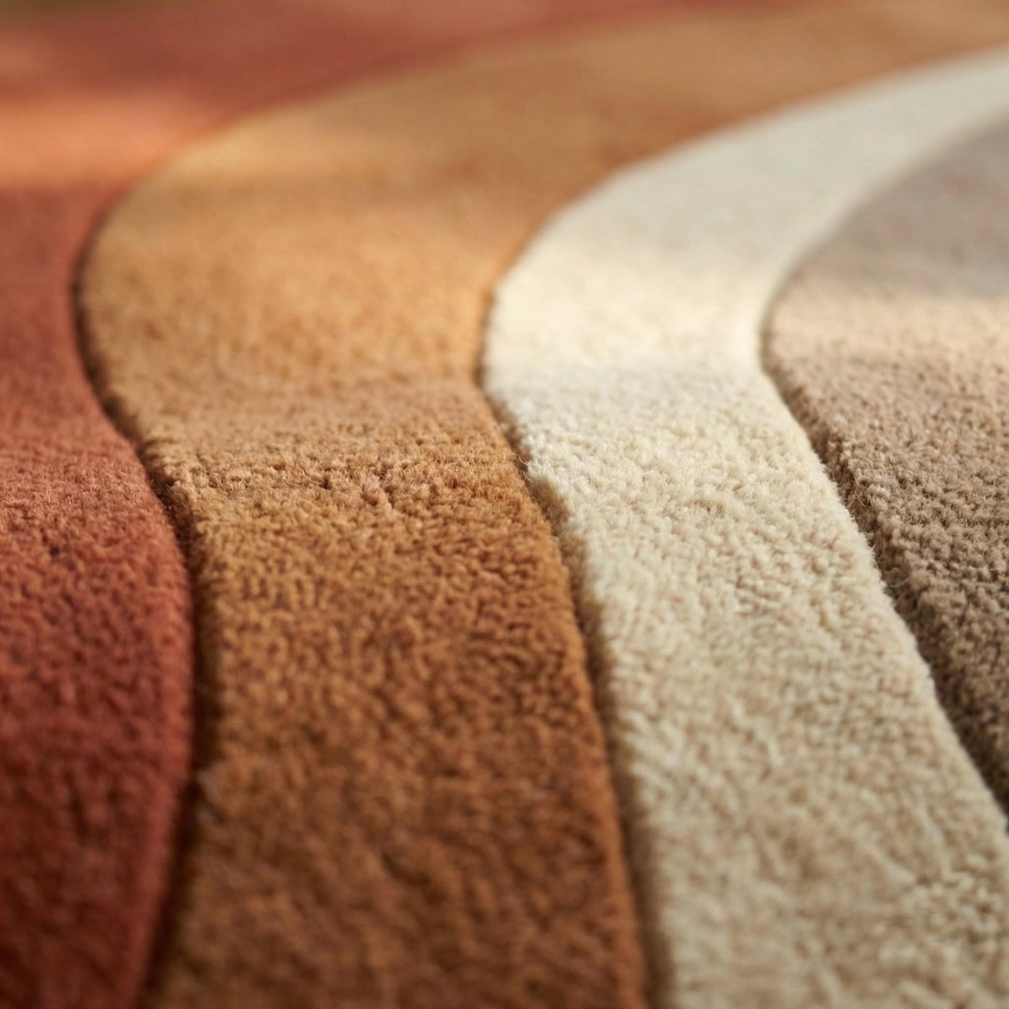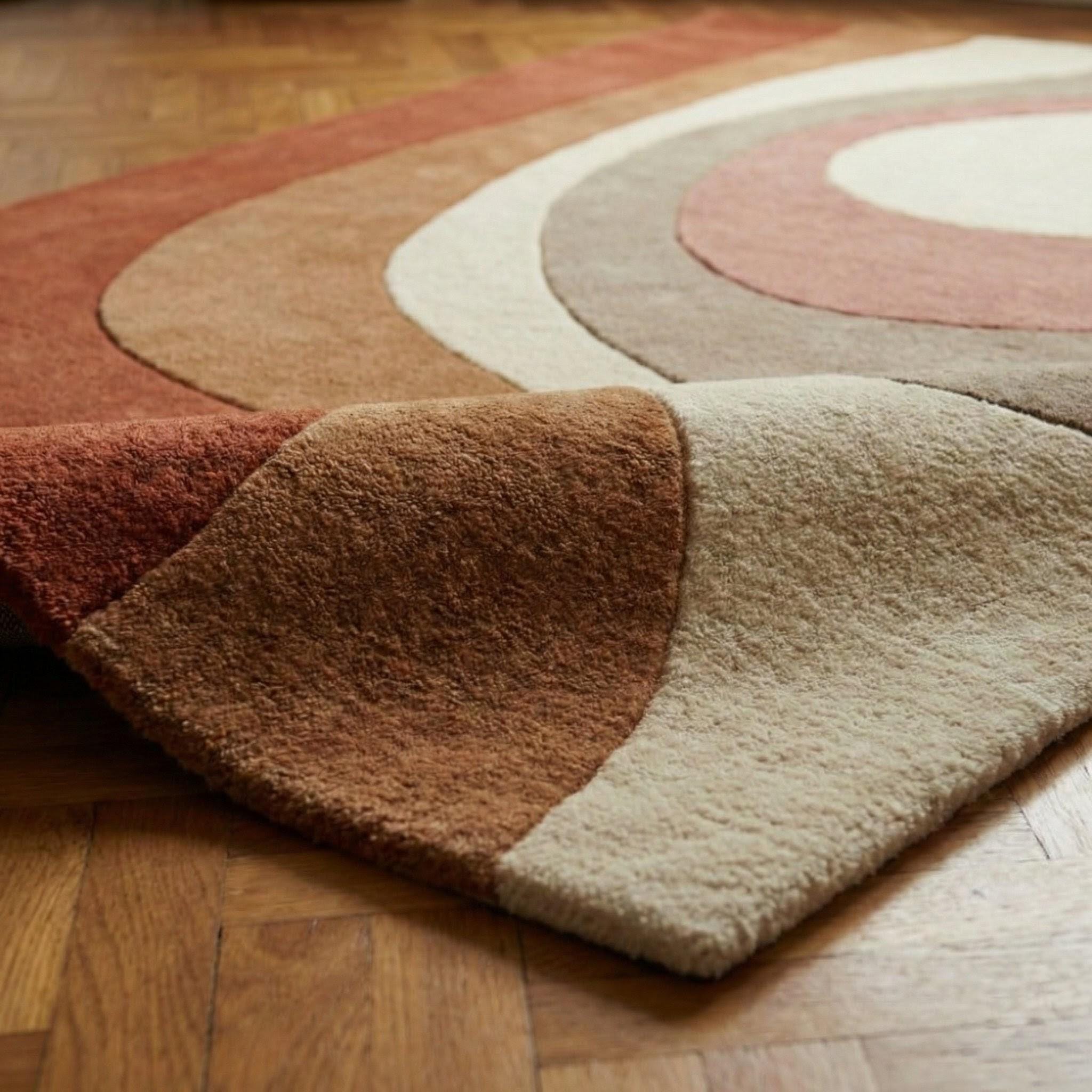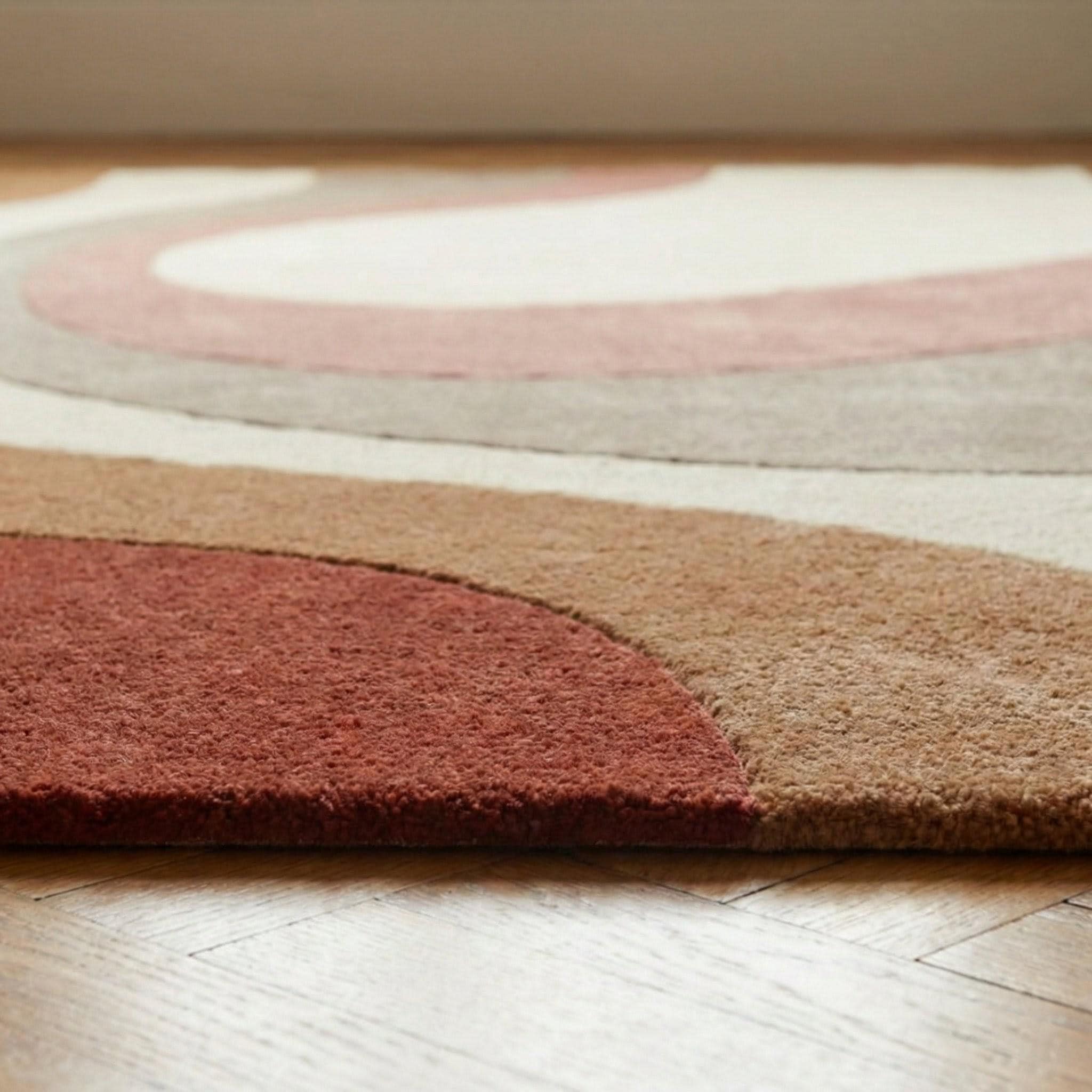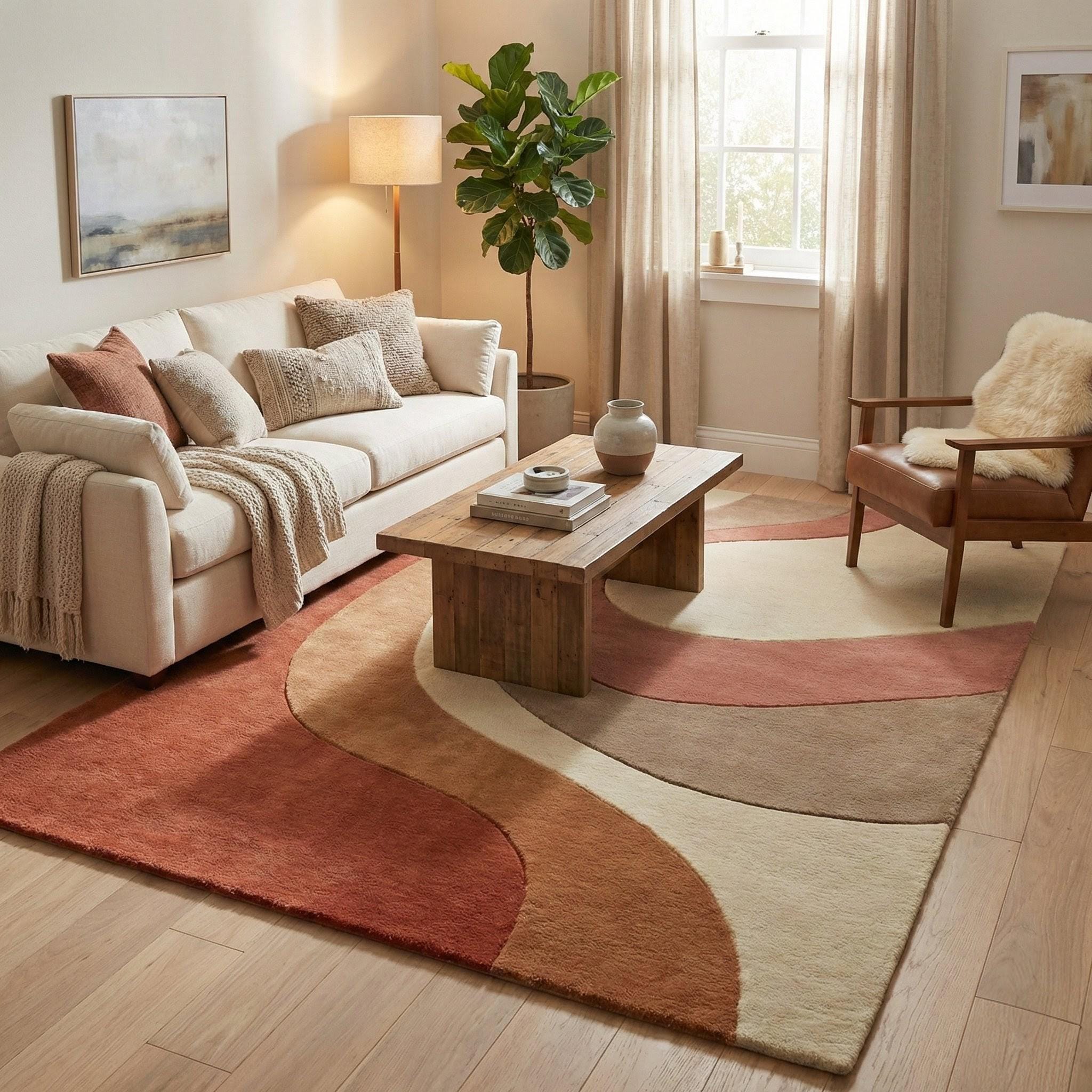 This modern abstract rug is a celebration of organic movement and timeless mid-century design. Flowing, sculptural curves ripple across the surface, creating a sense of calm rhythm and visual balance. Inspired by retro architecture and soft desert landscapes, the palette blends terracotta rust, warm caramel browns, muted taupe, and creamy ivory, making it both expressive and grounding. The design feels artistic yet approachable — bold enough to anchor a room, subtle enough to live with for years. Every curve is intentional, guiding the eye naturally through the space while adding depth without visual noise.